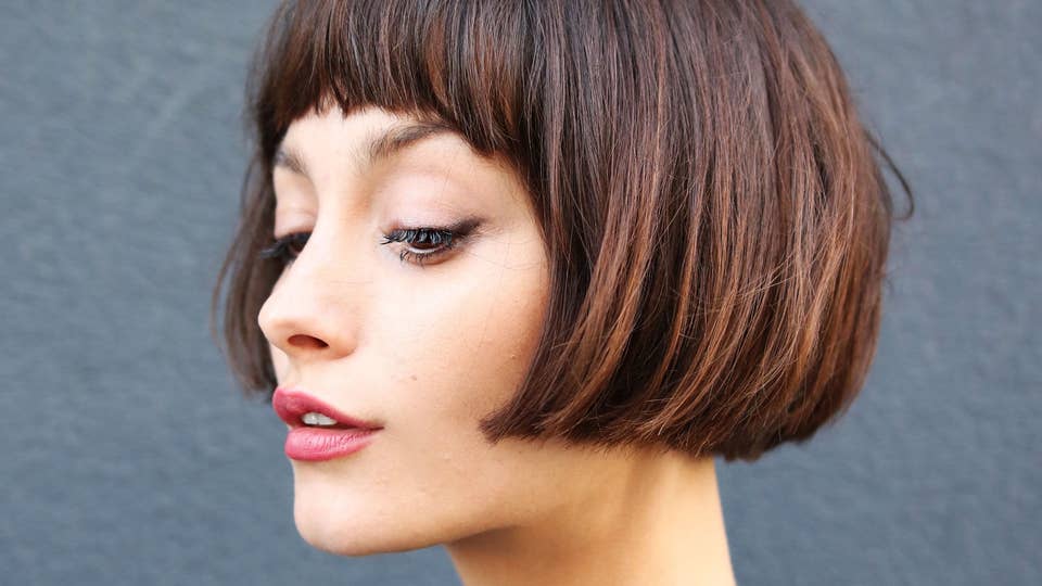 What To Ask For: A classic bob cut right to the lips; bangs cut above the eyebrows, slightly longer at the temples, and blended into the length.