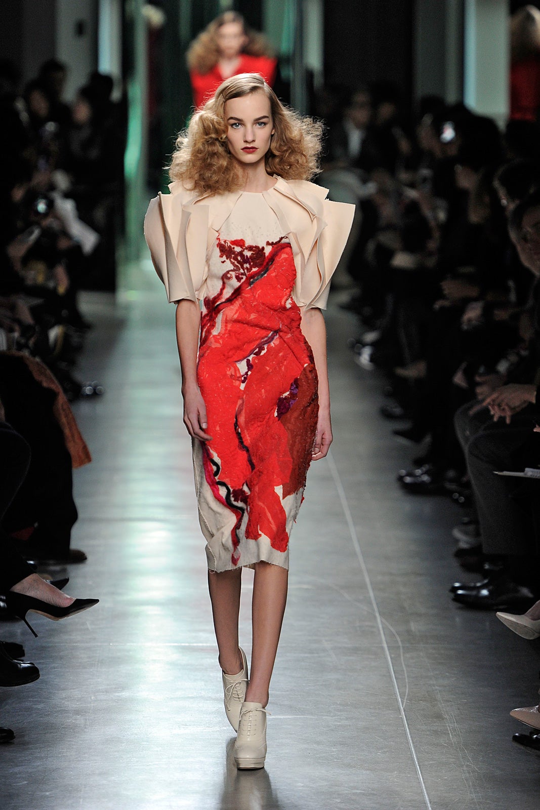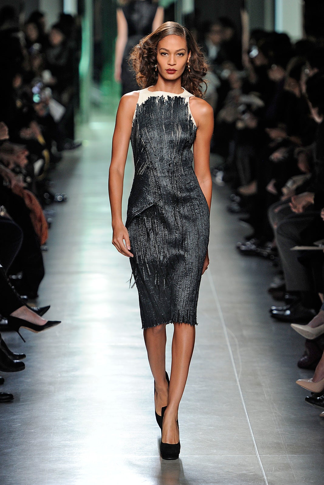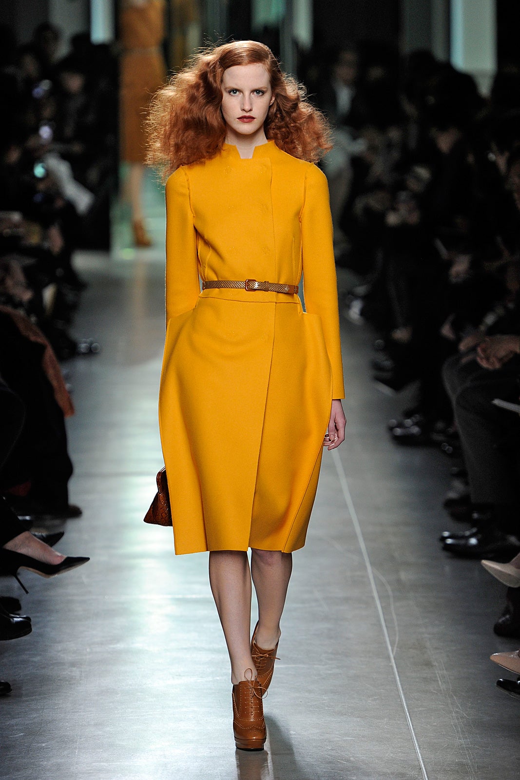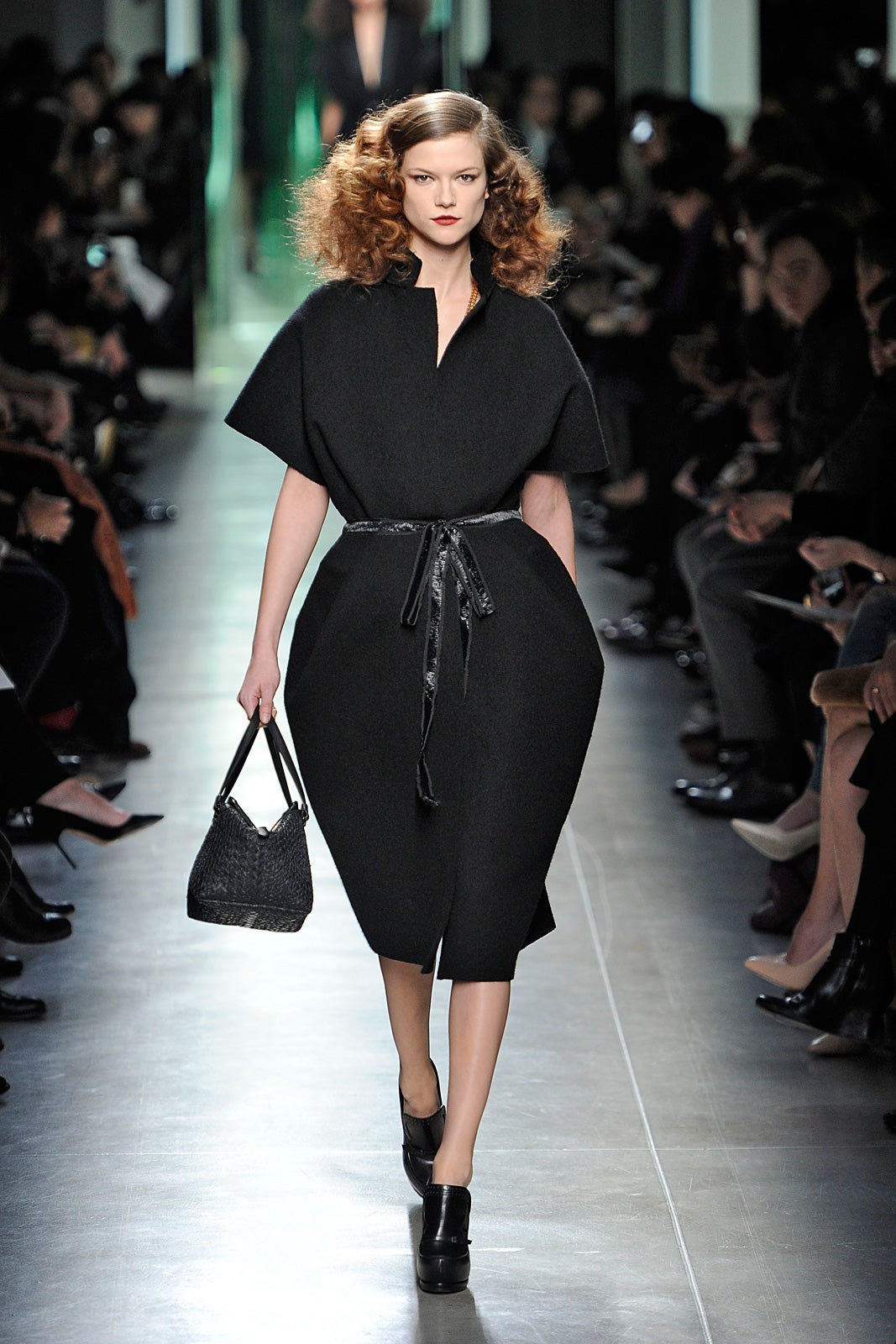 When your brand is nearly half a century old, it's hard not to look backward for inspiration. And though Bottega Veneta wasn't around in the days of Old Hollywood, it doesn't mean that its cocoon coats, buttery bags, and costume jewelry wouldn't look right at home on the starlets from the '30s. Exaggerated Marlene Dietrich hair and lips really made that old-school glamour that much more obvious — body-hugging sheath dresses, belted coats, and modestly cut skirts and trousers came straight out of the black-and-white era, but new techniques in felting, kept everything from feeling too retro.