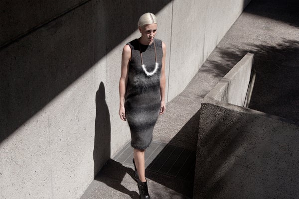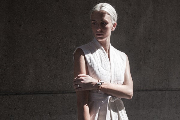 Mastering another mix of stark contrasts, the necklaces and bracelets were worn by a fair, platinum blonde with a penchant for hiding among the dark shadows. The gray concrete backdrop plays well with the boxy silhouettes of Min's stylings and a few streams of light that perfectly highlight Brook&Lyn's minimal, yet quite beautiful, pieces. Peep the latest designer-meets-blogger, industrial-meets-beauty shots, ahead.