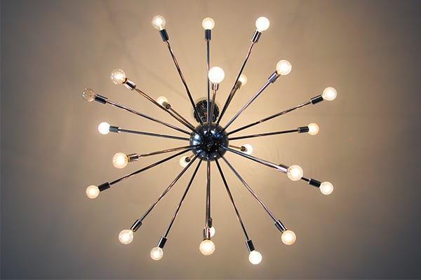 Other showstoppers, like an atomic Sputnick chandelier and lucite accents, infuse the space with an added dose of midcentury style. “I always joke with people that it’s disco '70s but it's not anymore. Now it’s eclectic '70s with a little glam. Okay, a lot of hollywood glam,” says Michele.