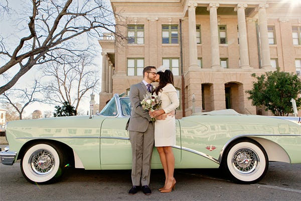 When Lover.ly's Editorial Director Rachel Miller got married in Texas this February, she had a morning civil ceremony at the historic Williamson County Courthouse followed by a brunch reception at Lamberts Downtown BBQ in Austin. The day was filled with lots of DIY details (including the bride's dress, the bridesmaids' capes, the oversized paper flowers, and the buttercream cakes) and vintage touches.