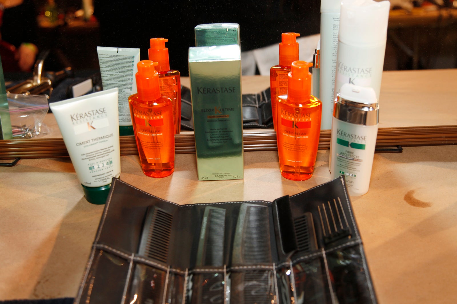For the hair, Odile Gilbert for Kérastase created a multi-textured look that combined sleek, middle-parted roots (tamped down using the brand's Resistance Ciment Thermique) with soft waves in a delicate contrast to the graphicness of the collection. Gilbert used a triple-barrel iron to ensure hair was shaped into a flowing wave rather than a defined curl. To make sure the waves kept that shape, she sprayed hair with Resistance Double Force. To add shine, she finished with a few drops of Elixir Ultime Moringa Immortel and running her fingers through the bottom of the hair to break up waves.