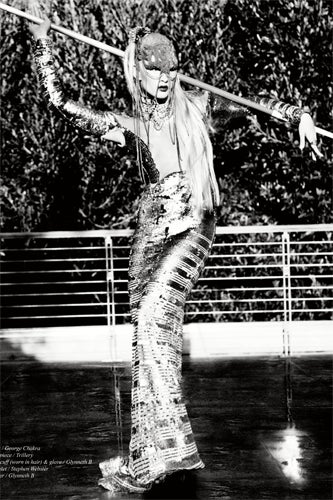 Full disclosure: we had to do a biiit of a double take the first time we saw the pictures (shot by Ellen Von Unwerth), to make sure it was actually Renn and not rapper-slash-singer Iggy Azalea, in that slicked-back ponytail. What with the platinum-blonde locks, extra-intense cat eye, and bold styling, Renn could easily pass for Azalea's long-lost twin. We love a bold, dramatic editorial, especially when it features one of our favorite ladies. And, hey, what’s more dramatic than shooting a bow and arrow in stilettos? Answer: Playing what looks to be a game of tug of war, topless, while your face is completely covered in lace. Intrigued? Click through to see all of her risk-taking shots for yourself.