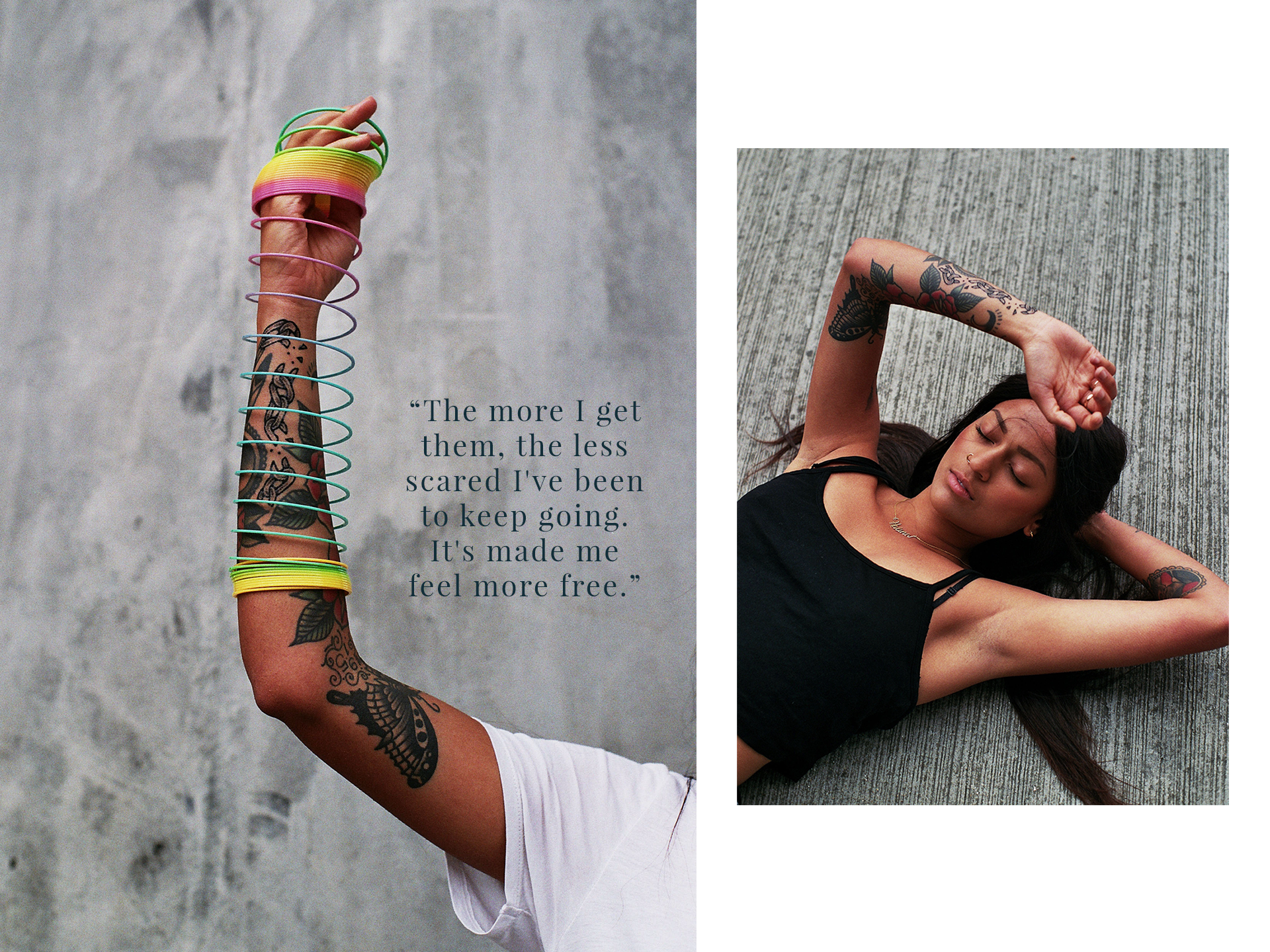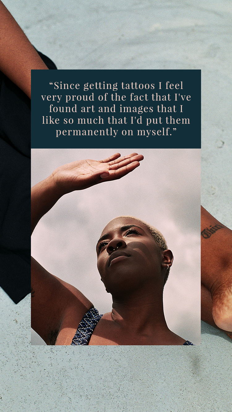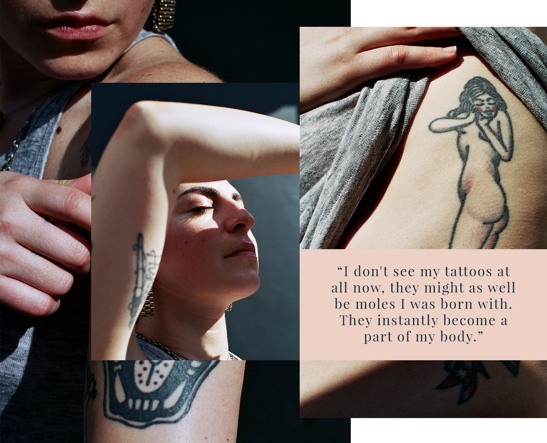 Manchmal kann meine Beziehung zu meinen Tattoos schwierig sein. Wenn mein Körperbewusstsein schwach ist, schaue ich sie an und denke mir „oh Gott, was hast du getan?” Es ist als wären sie schon immer Teil von mir und meiner Haut gewesen. Wenn mein Körperbewusstsein also gut ist, bin ich happy über meine Tattoos und will, dass man sie sieht. Es ist ein fließender Übergang der Emotionen.