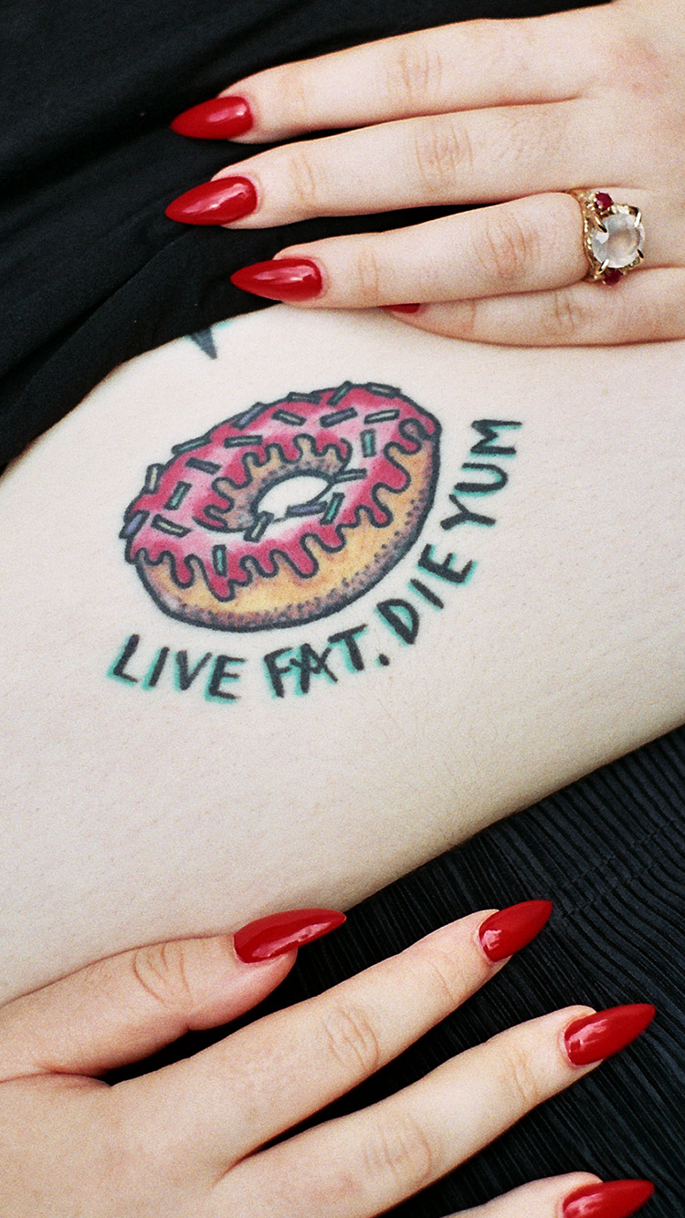 Ich habe 13 Tattoos und zwei davon werden oft von Leuten kommentiert. Das eine ist ein Doughnut. Ich habe es mir im Winter 2013 stechen lassen, als ich mich dick fühlte und davon auch nicht abkommen konnte. Ich wollte ein albernes Tattoo haben, mit dem ich mich selbst dafür feiern wollte, dass ich total zufrieden mit meinem Körper war. Es ist ziemlich verspielt und zeigt, dass ich wahrscheinlich immer dick sein werde, aber so okay damit bin, dass ich das für immer auf meinem Körper zeigen will. Mein Dicksein ist das fertige Produkt, genau so wie mein dauerhaftes Tattoo.