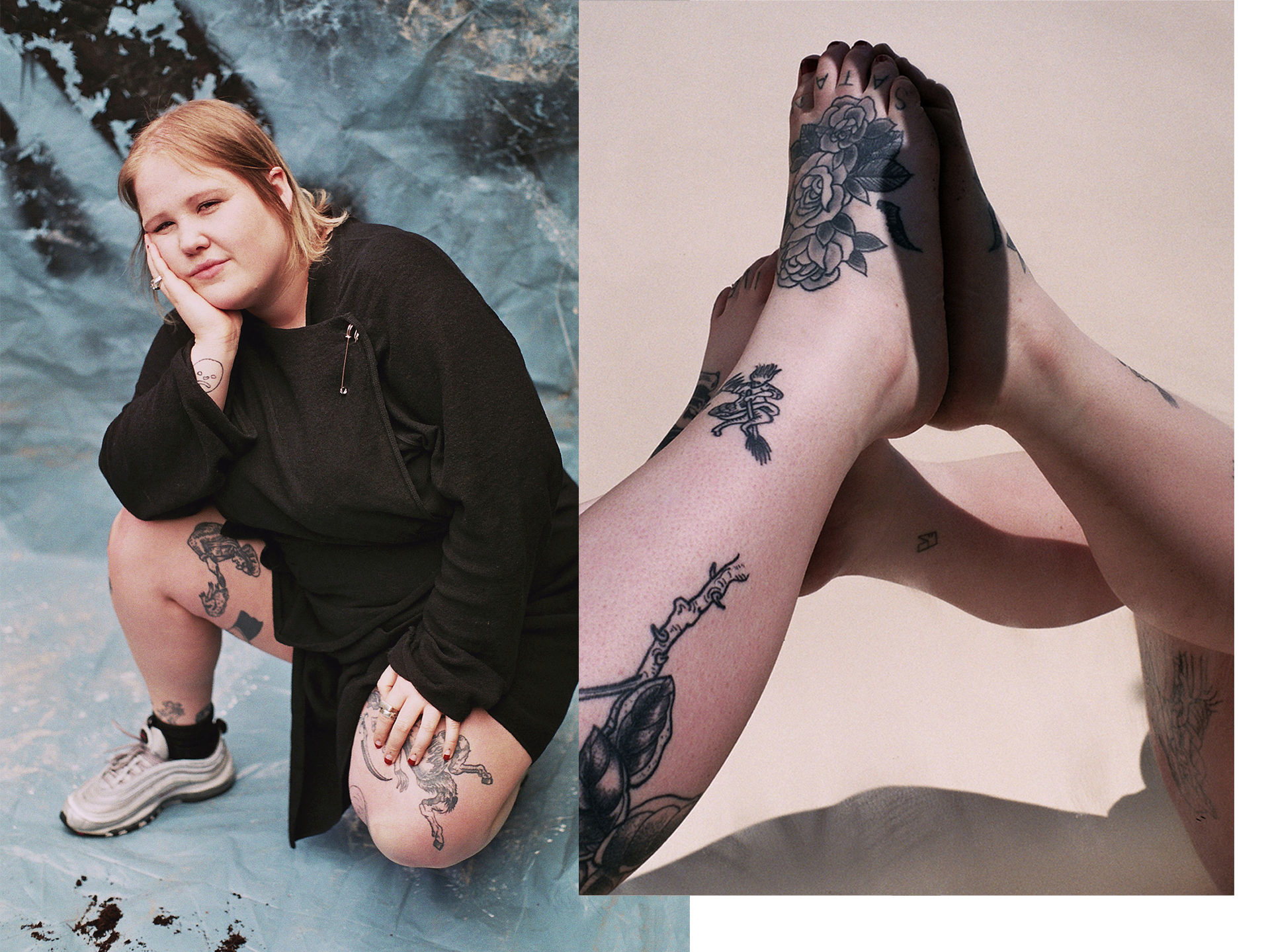 Meine erste Tätowierung habe ich mit 15 Jahren bekommen, was ziemlich unfassbar ist. Es ist total illegal, deshalb weiß ich auch schon gar nicht mehr, wie es eigentlich dazu kam. Es ist ein Umriss eines kleinen Sterns – ein klassisches und typisches Tattoo für die Zeit vor zehn Jahren, das auf meinen Fuß ist. Ich habe es noch nicht überstechen lassen. Ich finde, dass Menschen nichts bereuen sollten, denn in der damaligen Zeit war es genau das, was man wollte. Tattoos müssen nichts ‚bedeuten‘. Ich habe immer gute Erinnerungen an jedes einzelne von ihnen, weil ich sie zu einer bestimmten Zeit machen ließ. Die meisten von ihnen mag ich einfach nur, eines hat eine besondere Bedeutung, weil mein Freund und ich das gleiche haben, er ist Tätowierer.