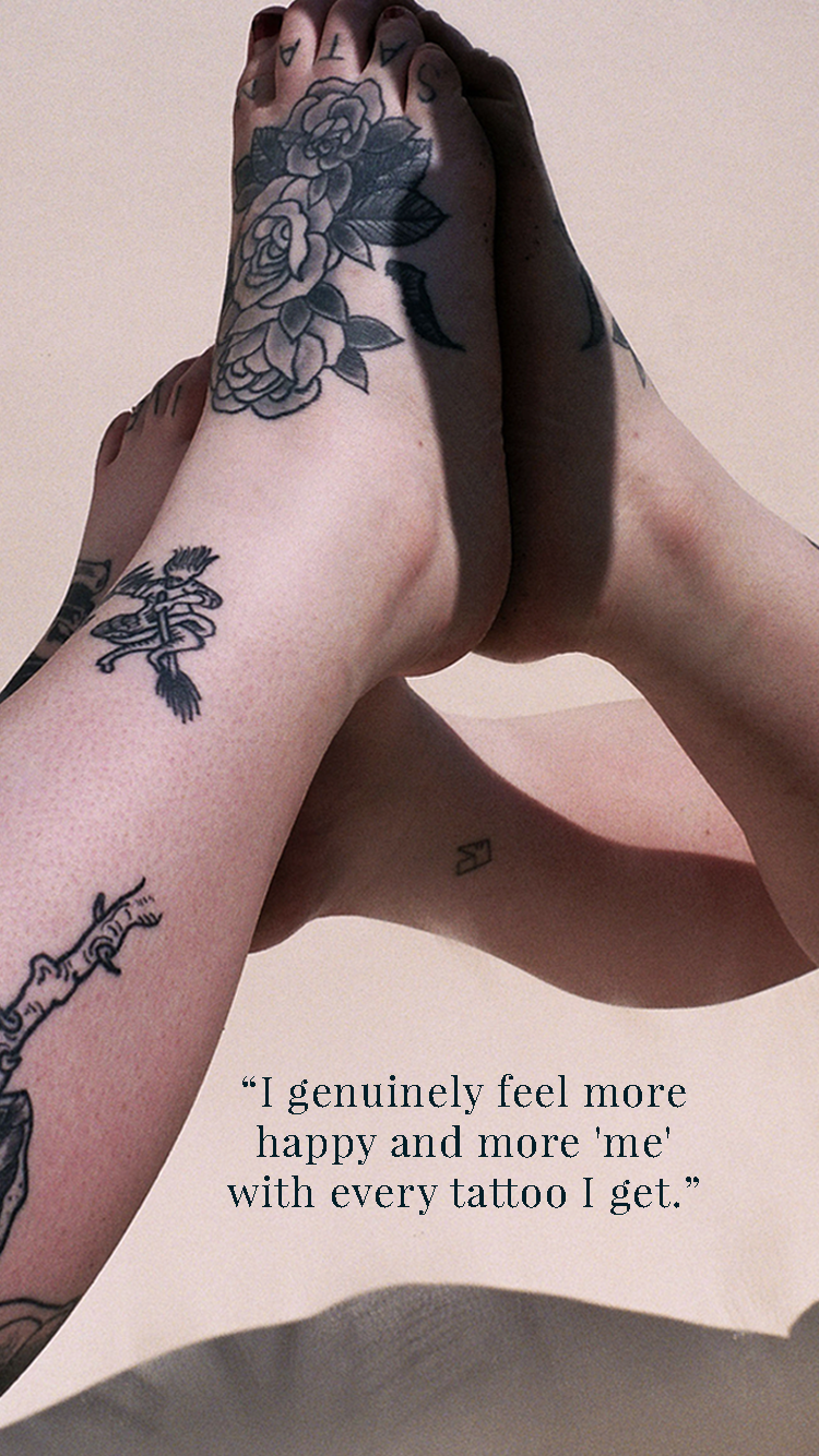 Ich bin wirklich glücklicher und fühle mich mehr nach ‚mir selbst‘ mit jedem Tattoo, das ich bekomme. Ich fühle mich so, als wäre ich jedes Mal ein Stückchen näher an der Person, die ich sein möchte. Das finale Bild setzt sich immer mehr zusammen. Seitdem ich mich tätowieren lasse, passieren nur gute Dinge. Durch sie bin ich mit allem wirklich glücklicher.