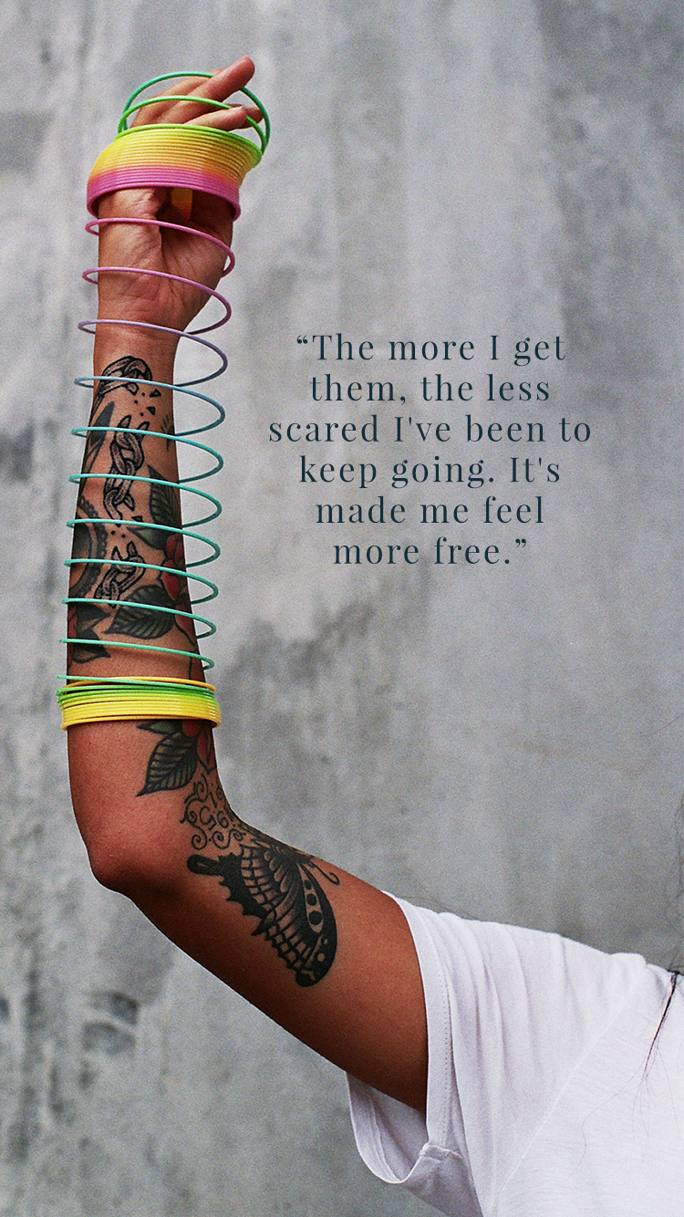 Meine ersten zehn Tattoos waren alle auf meinem Rücken oder meinen Rippen und eines auf meinem Knöchel – Stellen, die man einfach verstecken kann und die man sonst nicht unbedingt sieht. Ich war wirklich gehemmt, mich auf den Armen tätowieren zu lassen, denn wenn ich dann wollen würde, dass man sie sieht, würde man zwangsläufig auch meine Arme sehen und ich mag meine Arme nicht wirklich. Das erste Tattoo, das ich auf meinen Armen stechen ließ, war eigentlich dafür da, Wachstumsstreifen und Narben, die ich mir selbst zugefügt hatte, zu überdecken. Ich dachte mir ich würde zwei Fliegen mit einer Klappe schlagen: Das Tattoo würde die Narben verdecken und die Menschen würden mehr darauf achten als auf die Narben und Streifen. Es ist eine langsame Entwicklung und ich hoffe, dass ich irgendwann an den Punkt komme, an dem ich das Tattoo wirklich lieben kann, aber das kommt und geht.