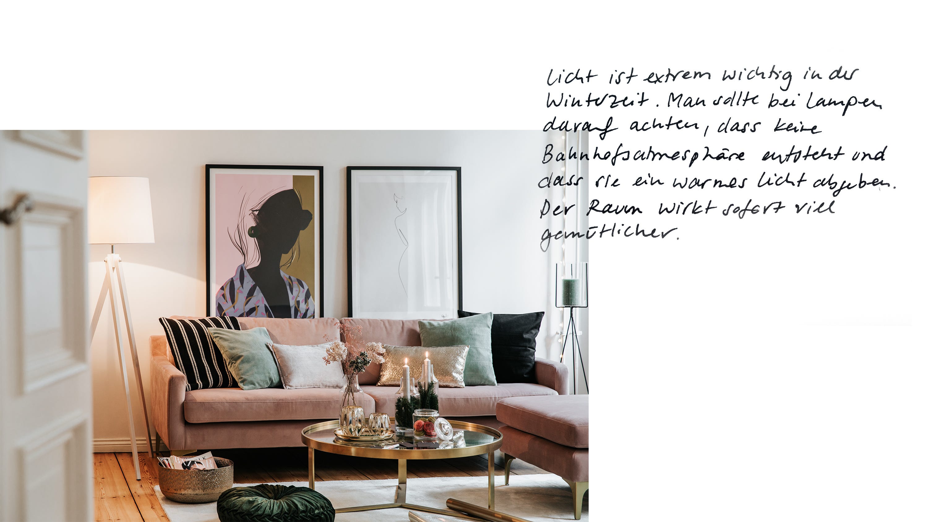 In erster Linie natürlich durch Licht. Bei mir brennen immer Kerzen im Winter, das sorgt für Harmonie und Ruhe. Bei Lampen ist es total wichtig, dass sie keine Bahnhofsatmosphäre erzeugen, sondern warmes Licht abgeben. So wirkt eine Wohnung sofort gemütlich. Wichtig finde ich auch Kissen in unterschiedlichen Farben, Größen und Materialien. Sie lassen es sofort wohnlich wirken. In meinem Wohnzimmer befindet sich ein altrosanes Sofa aus Samt, darauf mixe ich Kissen aus Stoff, Jacquard und Cord. Die Farben der Kissen variieren je nach Laune und Jahreszeit.