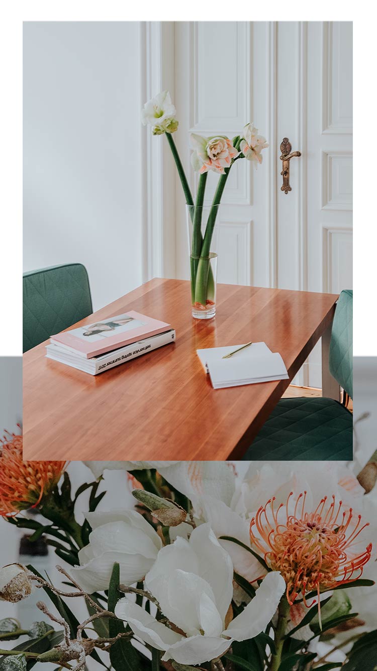 Frische Blumen! Und dazu passenden Vasen in allen Farben, Formen und Größen. Durch die Farbe der Blumen und die Form und Farbe der Vase kann man einen Look sofort total verändern.