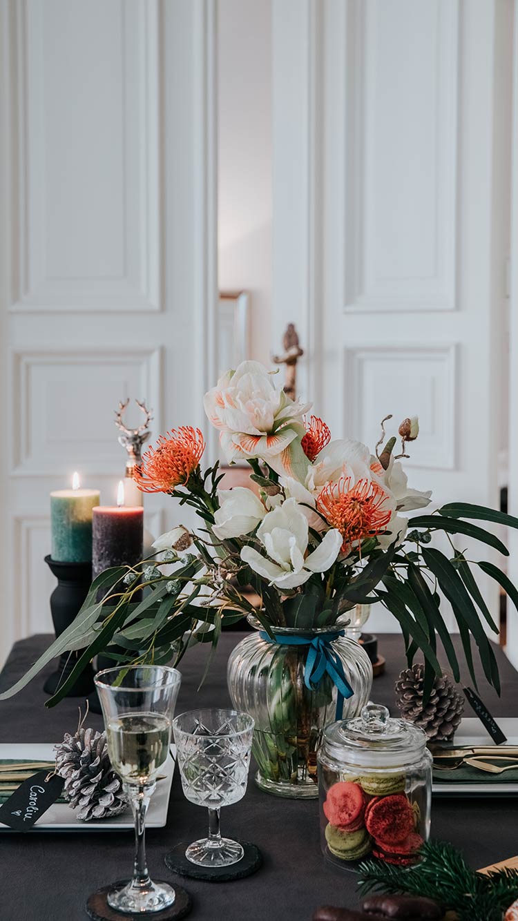 Goldbesteck, Weingläser, Bonbonglas, Vasen, Teller, Servietten, weiße Dekoblumen, Tannenzapfen, Kerzenständer, Kerzen von DEPOT.