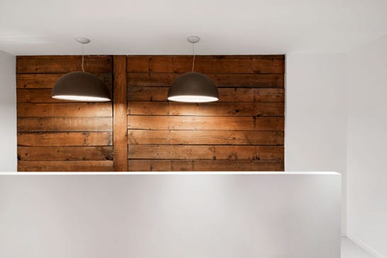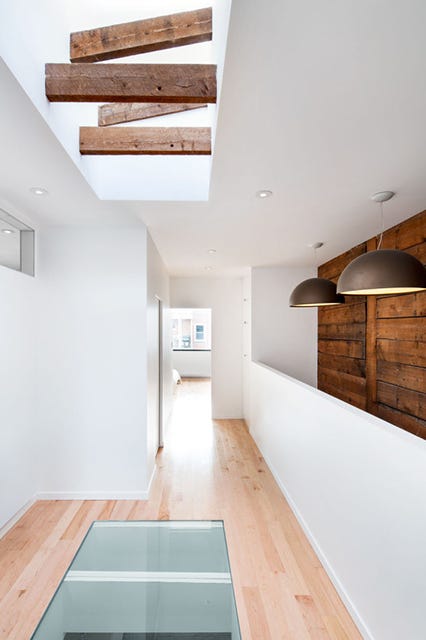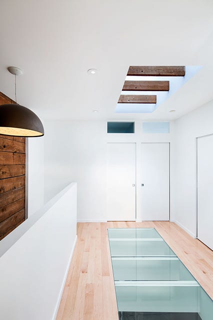 The architects were focused on exposing the existing wooden structure, which included both the walls and beams, and supporting them with natural materials. An interesting characteristic of the home includes a skylight and glass floor placed at the center of the home that filters natural light to both the upper and lower levels of the home.