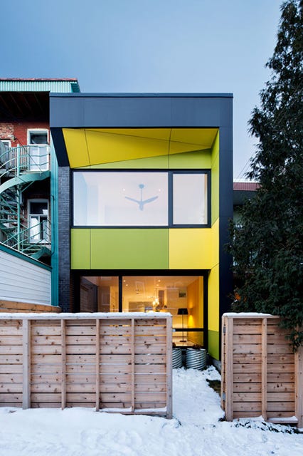 The extension includes a master bedroom on the upper level and a family room on the ground level. The building resonates a unique characteristic to the typical Montreal laneway neighborhood. The architects describe the extension as a beacon of novelty and dynamism. While minimal work was done to the front facade, the extension was designed in contrast, with bright colors, an angled form, and generous glazing.