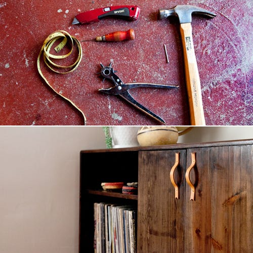 About a year ago, Stacey designed a credenza and her husband Rick’s dad built it for them as a moving-into-their-new-place gift. Although the knobs originally chosen worked just fine, they weren’t “perfect.” So, Steven, Stacey and Rick put their heads together and came up with a solution that would match with their style — leather pulls! I love the little details and how they add some softness to the overall piece. Thanks so much to Steven, Stacy, and Rick for sharing their how-to with us! xo, grace