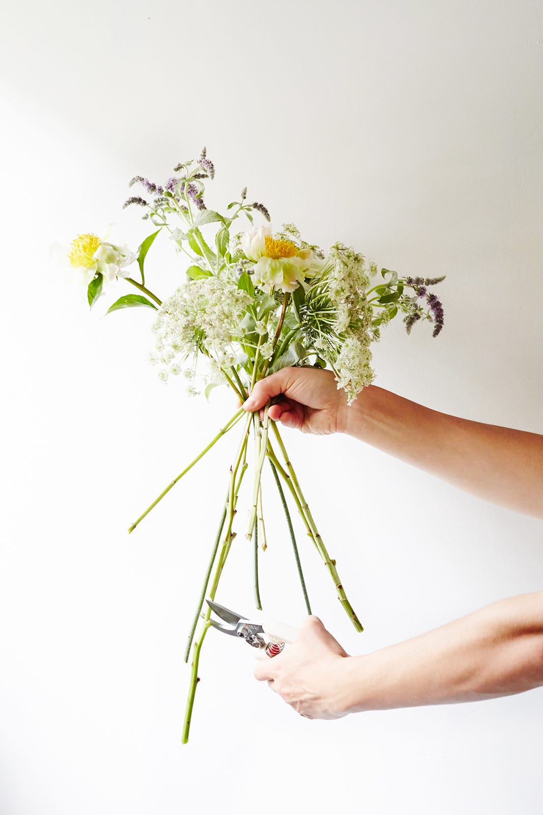 She broke down the basics with step-by-step instructions for two in-season arrangements: one romantic and the other a free-spirited sensibility. Of course, you don't have to be slipping on a wedding band this summer to make them. A vase will do just fine.