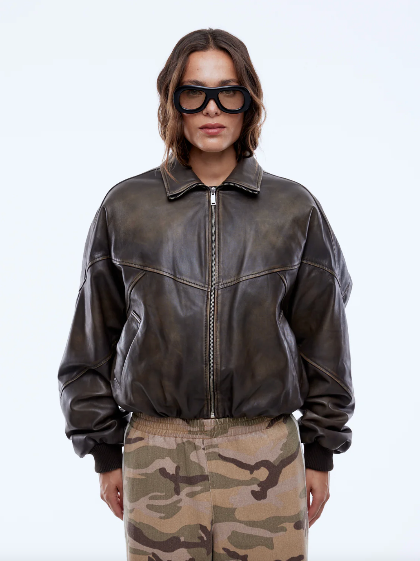 For an effortless weekend look, pair a leather bomber with some camo pants — or channel your best 'Intimidating Hot Girl' energy by layering your leather jacket over a dress. Throw on a no-nonsense pair of dark aviators to complete the look.