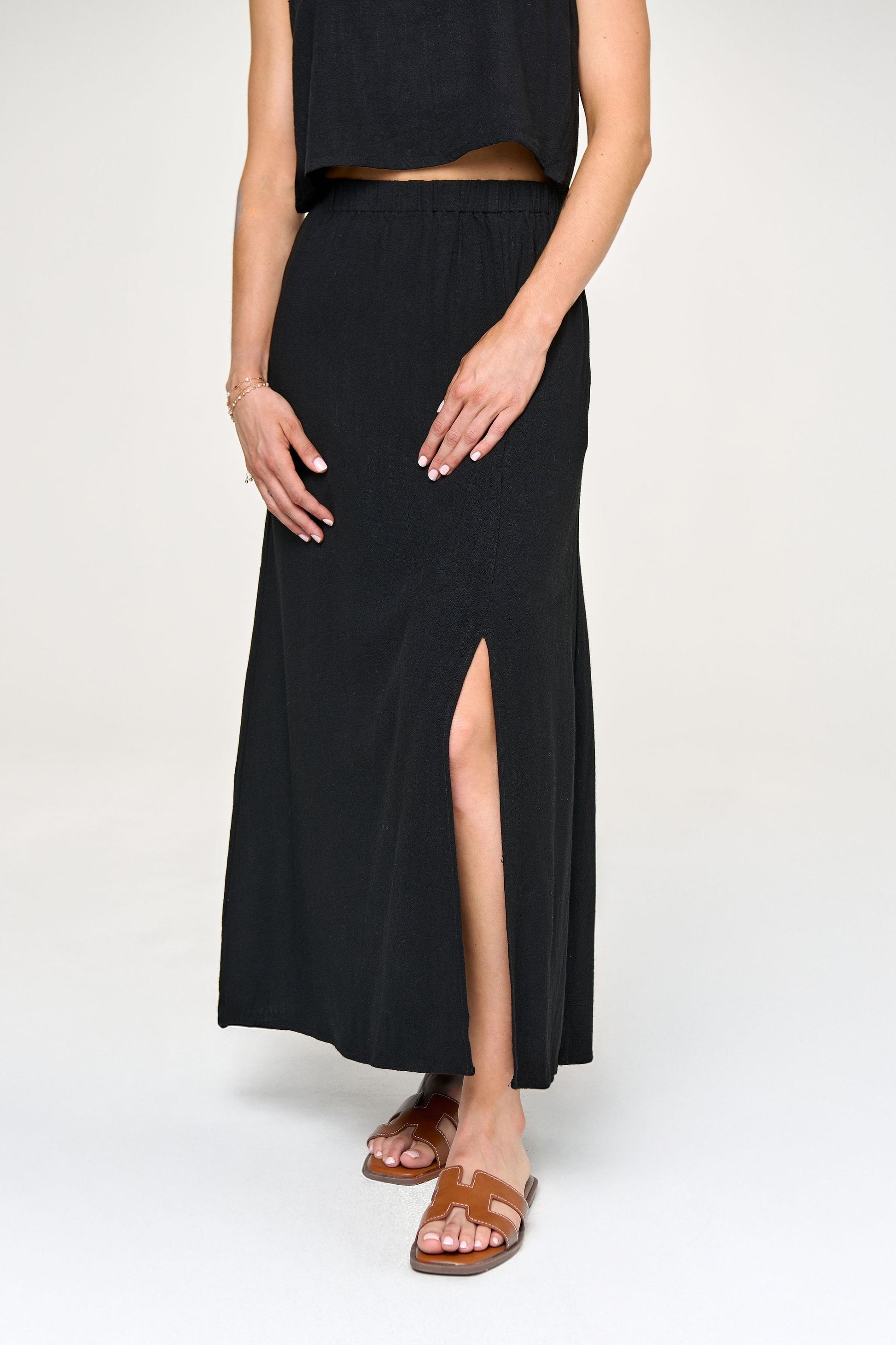 The length of the skirt pairs well with the blazer because they both have long lines, so they draw the eye down the body, creating the illusion of more height. Additionally, the top’s lower-cut neckline and the skirt’s delicate, semi-sheer fabric add some dimension to balance the boxy blazer silhouette. I opted for tall boots with the skirt to bring in more of the black colour, and finished it off with a gold-studded handbag and mixed-metal jewellery.