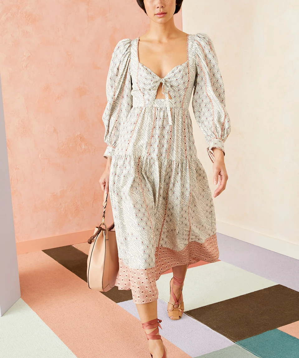 Holmes’ dress, called the Suki dress, is a product of the New York-based brand’s spring ‘21 collection. The tiered, crepe de chine frock features long, poofy sleeves; a midi hemline, and a patchwork pattern. While it’s currently available in all sizes, it will cost you a steep $790. That said, if you’re looking to splurge on something to base your seasonal wardrobe around, you’ll be hard-pressed to find a better spring dress given that both puff-sleeve dresses and the cottagecore aesthetic continue to trend in fashion.