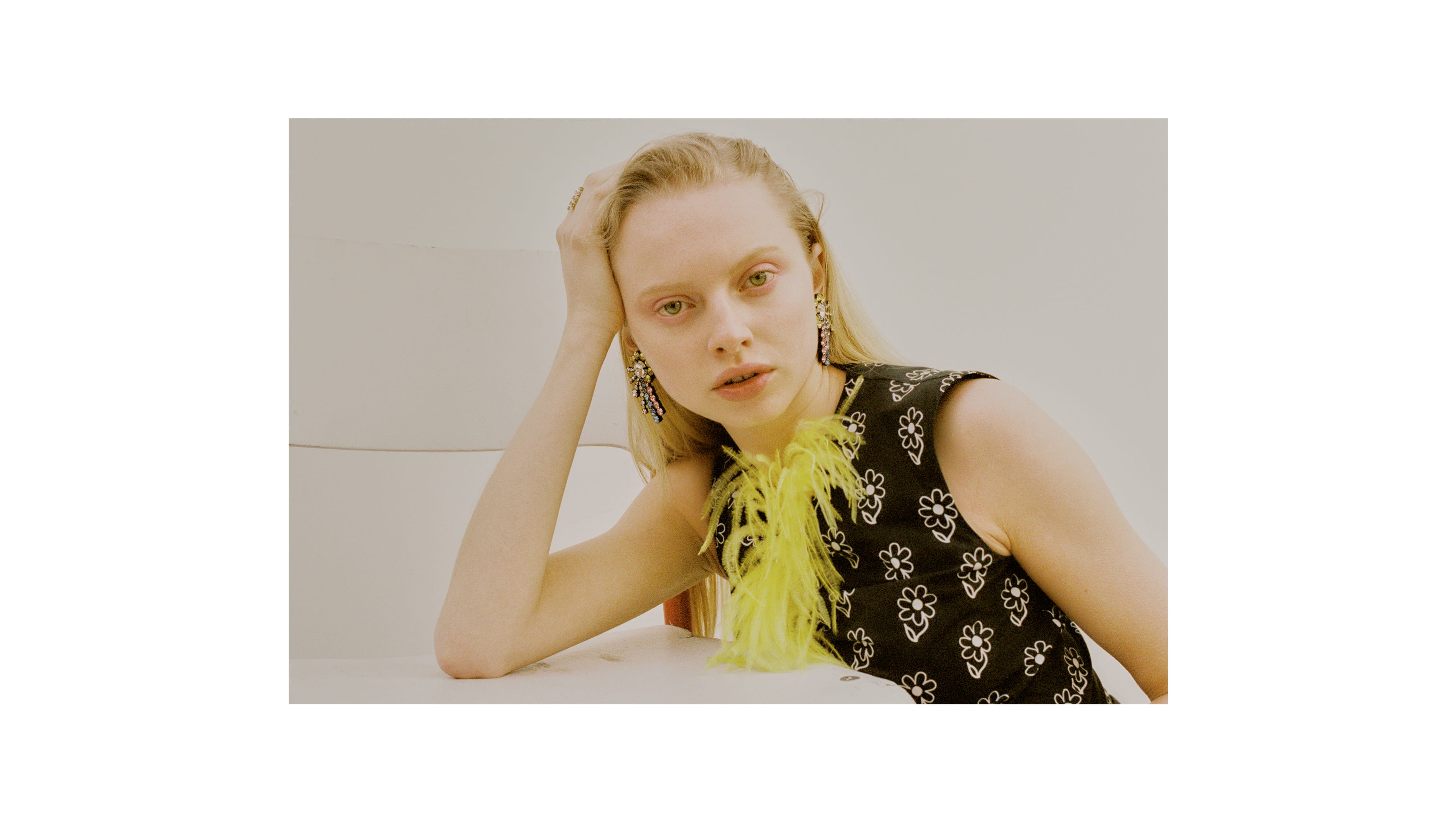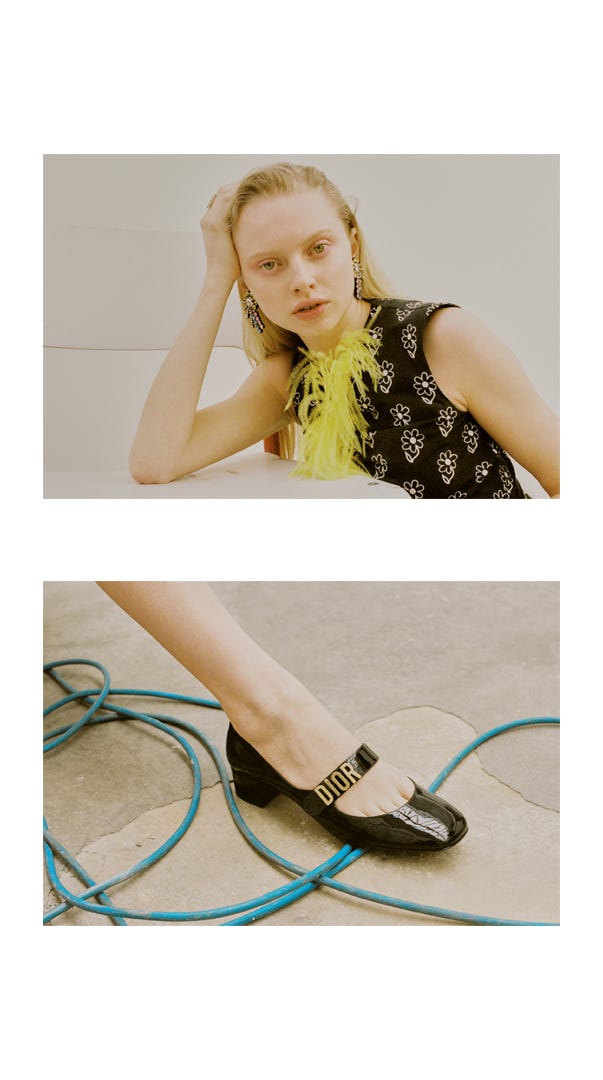India wears Ashley Williams earrings, Ashley Williams feather dress, Delfina Delettrez rings, Dior patent shoes
