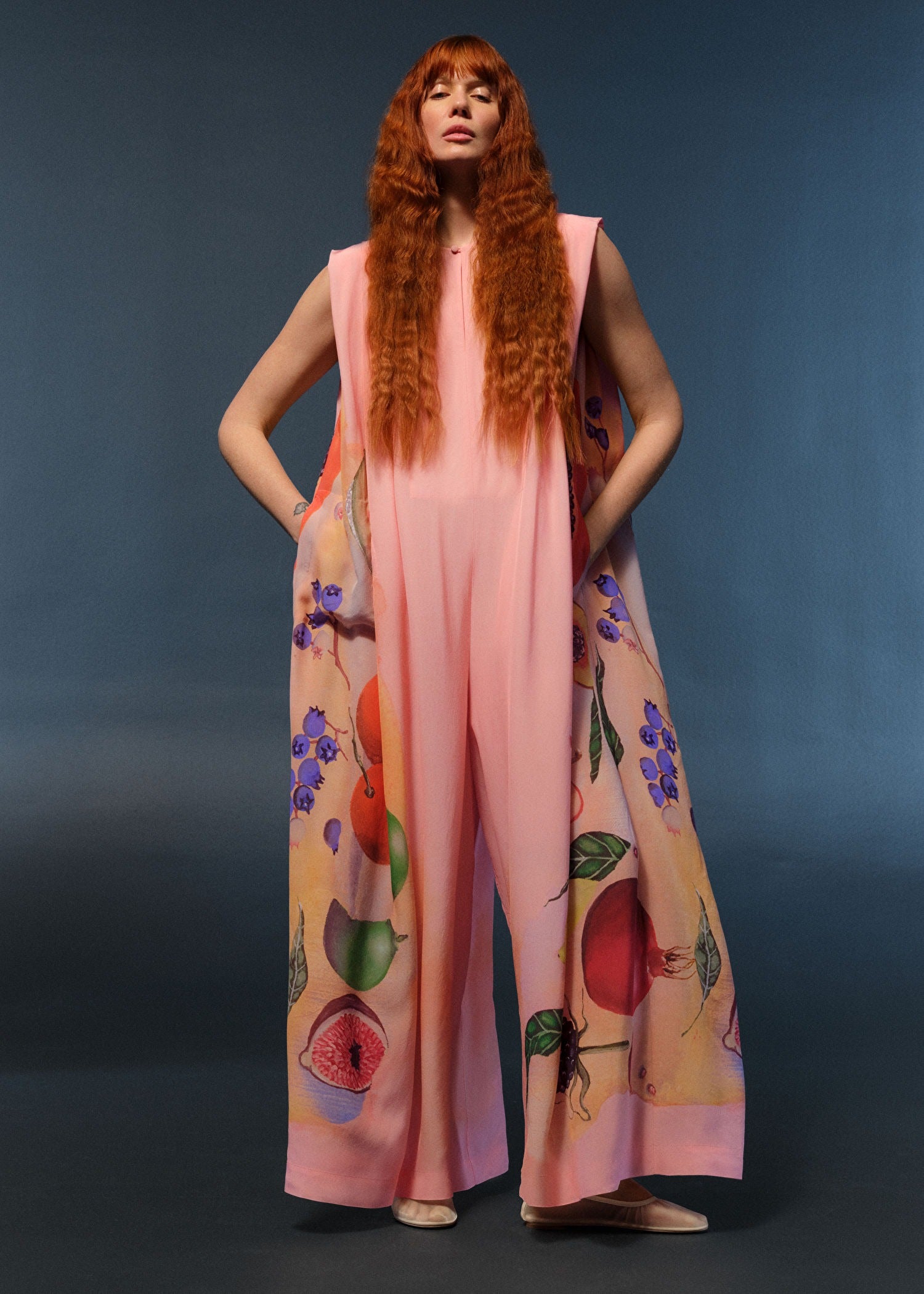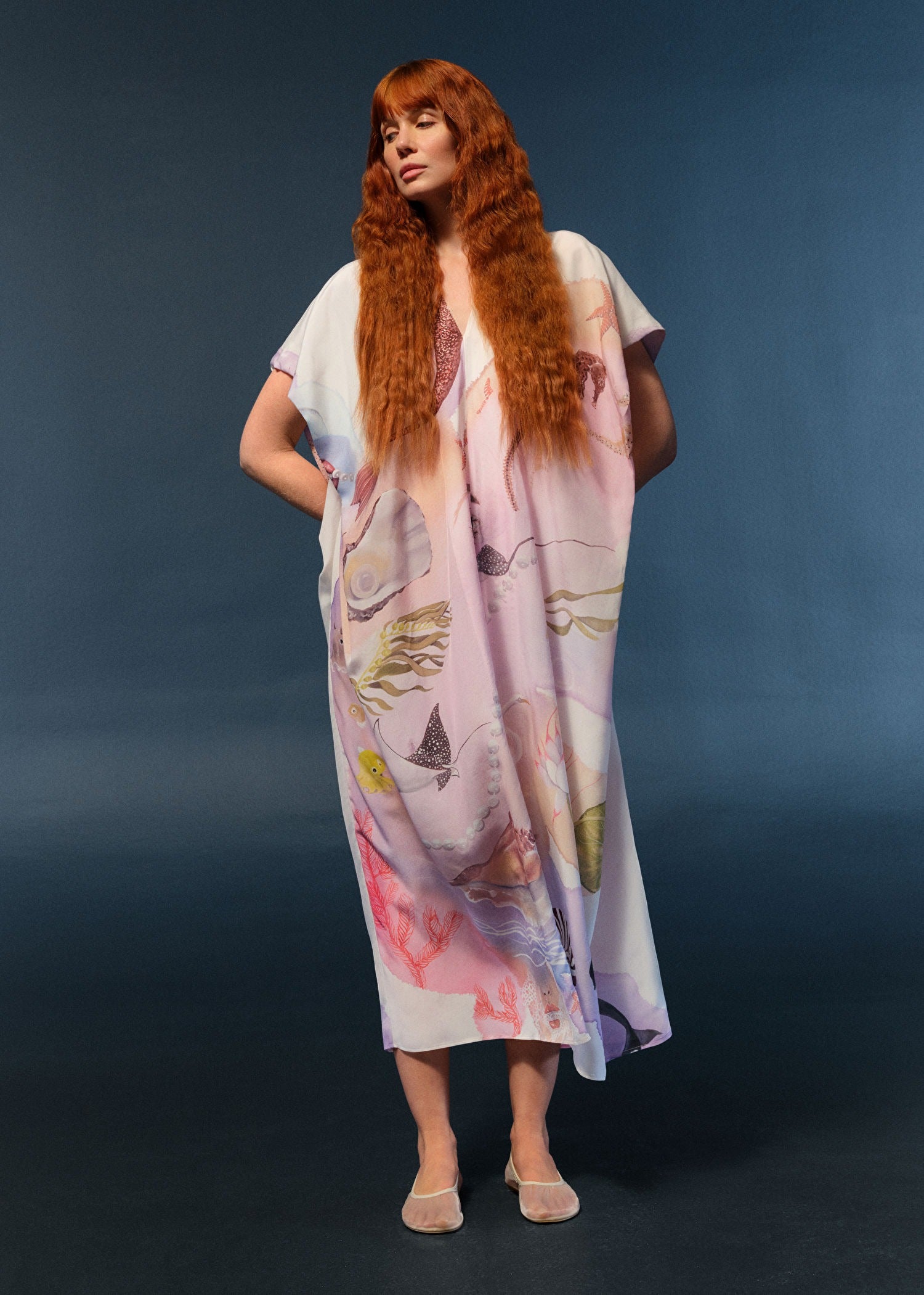 The limited capsule collection — there are just four pieces in the drop — took inspiration from Lance’s work, which often features fantasy-fuelled landscapes peppered with mystical symbols and still-life fruit. This translated into two caftans that depict a swan wrapped around a flower that has an eye (a frequently used motif by Lance) at its centre and an underwater scene filled with watercolour pearls, shells, and sea creatures; a one-shoulder dress with an abstract pastel print; and a whimsical fruit-print jumpsuit. “The ideas and symbols [for my paintings] come from sources like tarot readings or from things I perceive during meditation when trying to listen to something beyond myself,” Lance said in the press release.