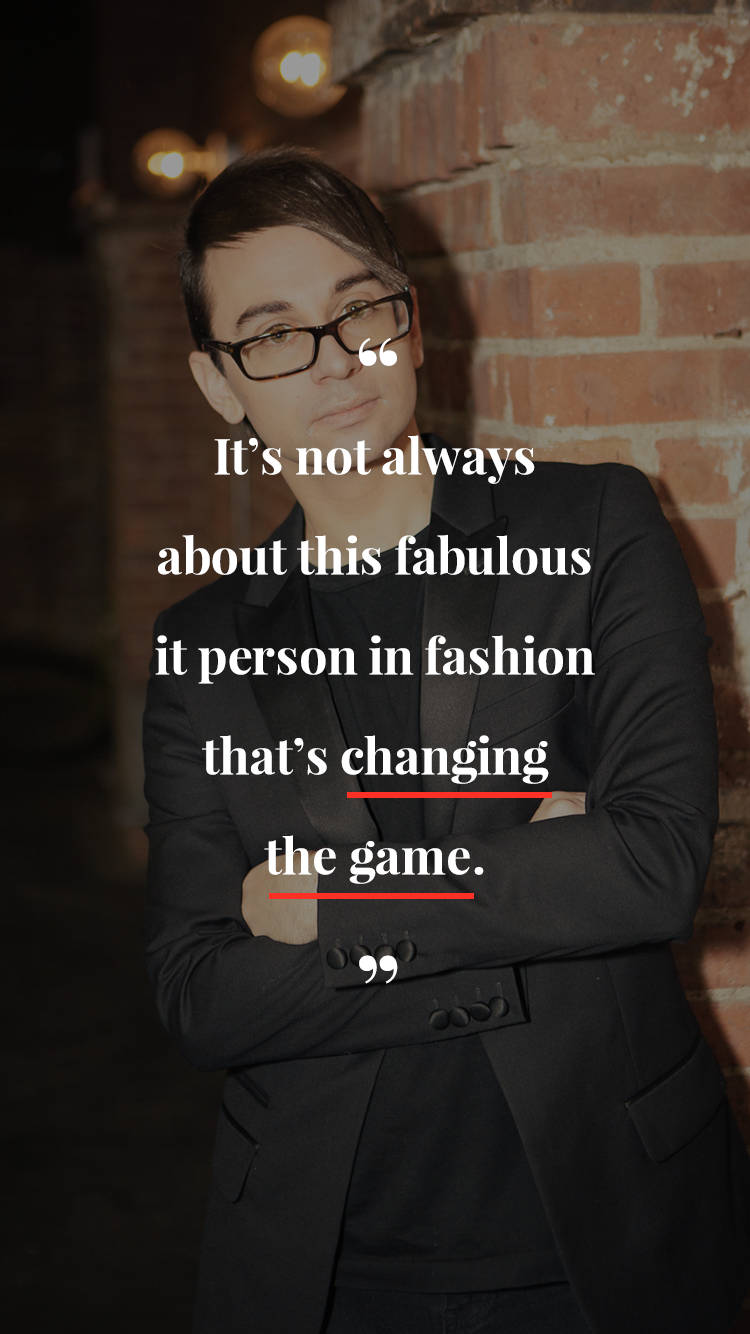"It’s strange,” he says. “It is different, and people for a long time said different is not right.” Different has certainly proven otherwise in this case, which Siriano credits to not immediately being welcomed into fashion’s elite inner circle a decade ago. “For the first six years, nobody gave a shit. I didn’t have the industry on my side in the beginning,” he says. “When I started, so did a lot of other people. Jason [Wu], Prabal [Gurung], early on I thought I have to be like them and doing what they’re doing and getting what they’re getting. You compare. I used to take it so personal, but it’s not always about this fabulous It person in fashion that’s changing the game.”