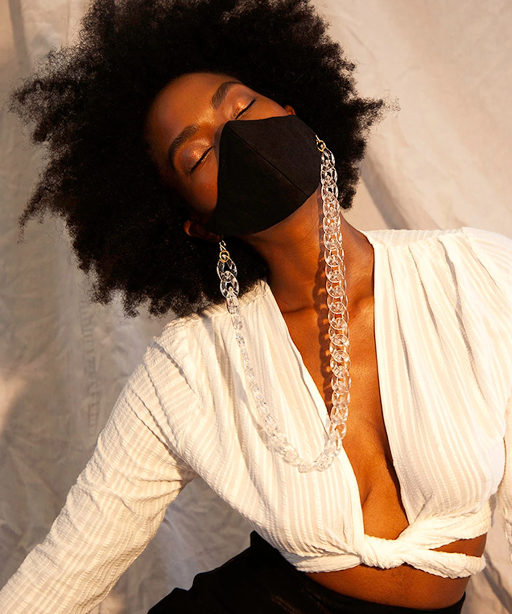 Fashion stylist Karen Perez, likewise, didn’t envision making face masks prior to 2020. But when clients came to her “with requests on finding them high-end, chic masks,” she saw a need to create one that would make a statement. “I decided to design my own. I wanted to create a mask that was feminine, chic,” she says. “The chains added a nice touch.” While Second Wind’s face masks were unique enough for their linen material (the brand has since launched styles in silk as well), custom fit (something that is still rare), and general style factor, it was indeed the chains that came attached with them that were still a novelty at the point of the pandemic and separated them from other brands making cloth masks. During the first pre-sale in July, Second Wind sold over 10,000 units in 24 hours.
