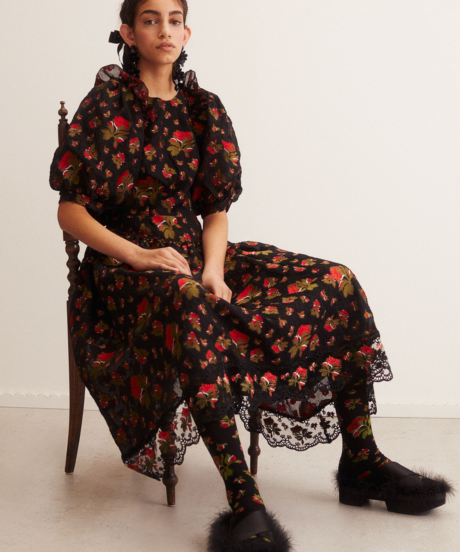 On Wednesday, the day before the launch of the H&M x Simone Rocha collaboration — a 111-piece collection of womenswear, menswear, and childrenswear — Chloë Sevigny was spotted in New York City wearing a piece from the highly anticipated collection. Her pick? A black-and-red floral frock with puff sleeves and a lace hem. If you were waiting for a sign to shop the collection, you just got it.
