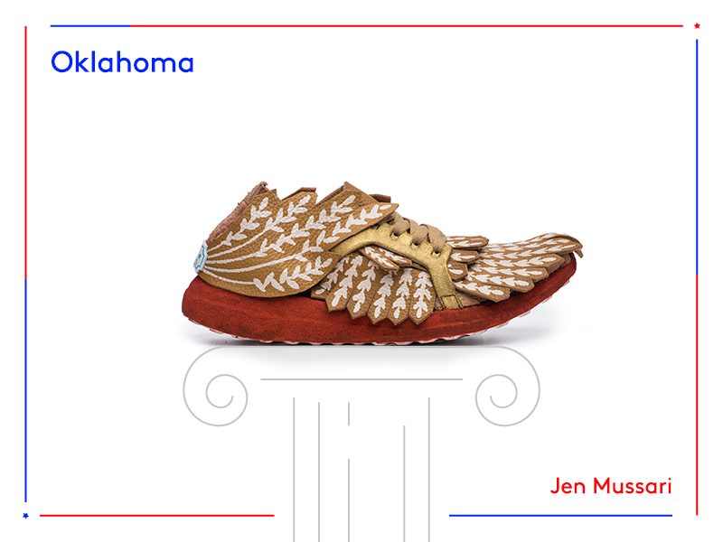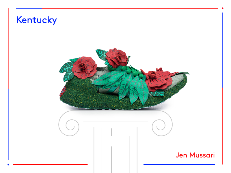 Well, using sand, acrylic paint, thread, beading, clay, faux flowers, and more, each artist outdid themselves with their one-of-a-kind designs. The once-white kicks now boast illustrations inspired by the gemstones, local flora, regional cuisines, and varied landscapes of each locale. Think: peaches for Georgia, purple lilac for New Hampshire, and mountainscapes and canyons for Utah.