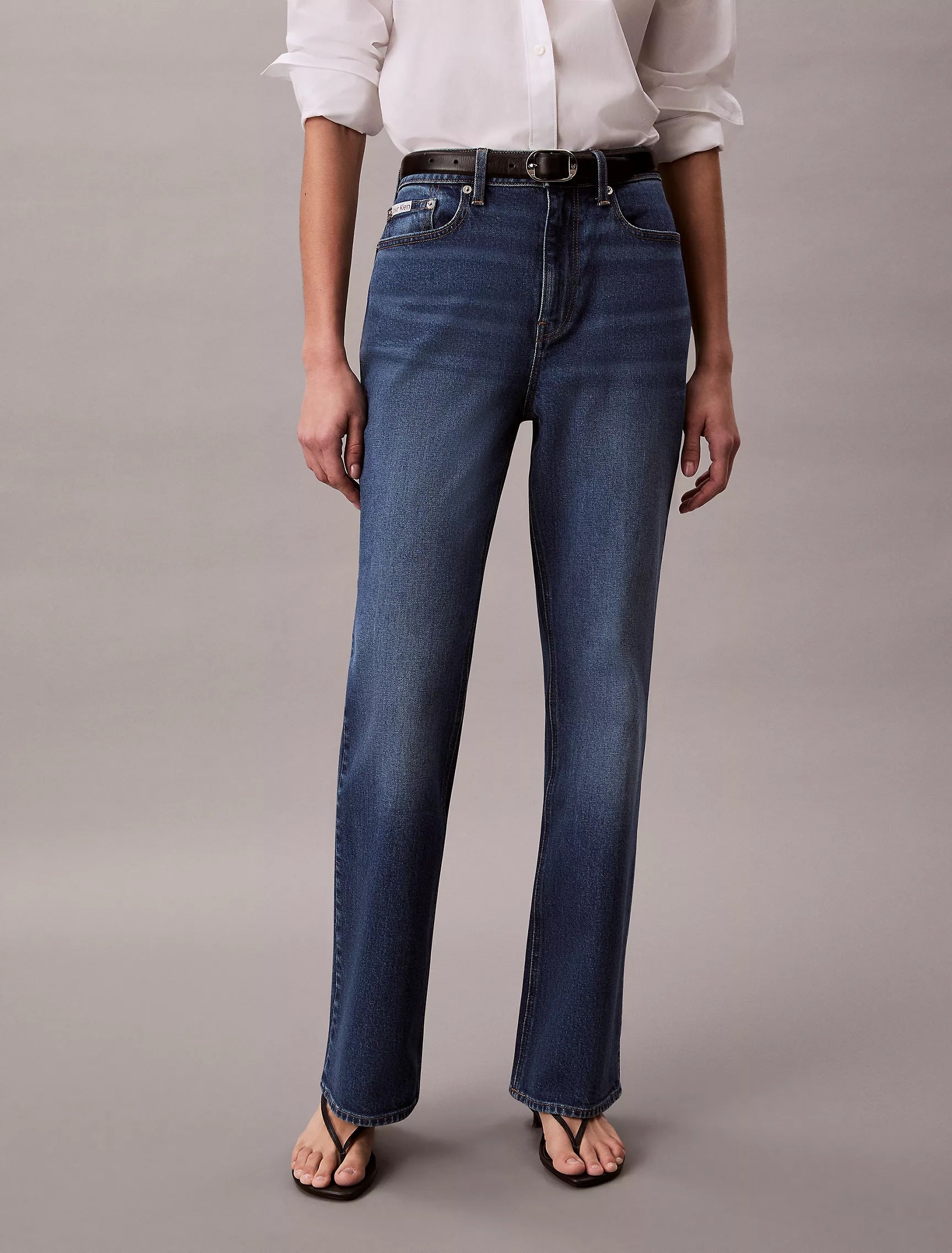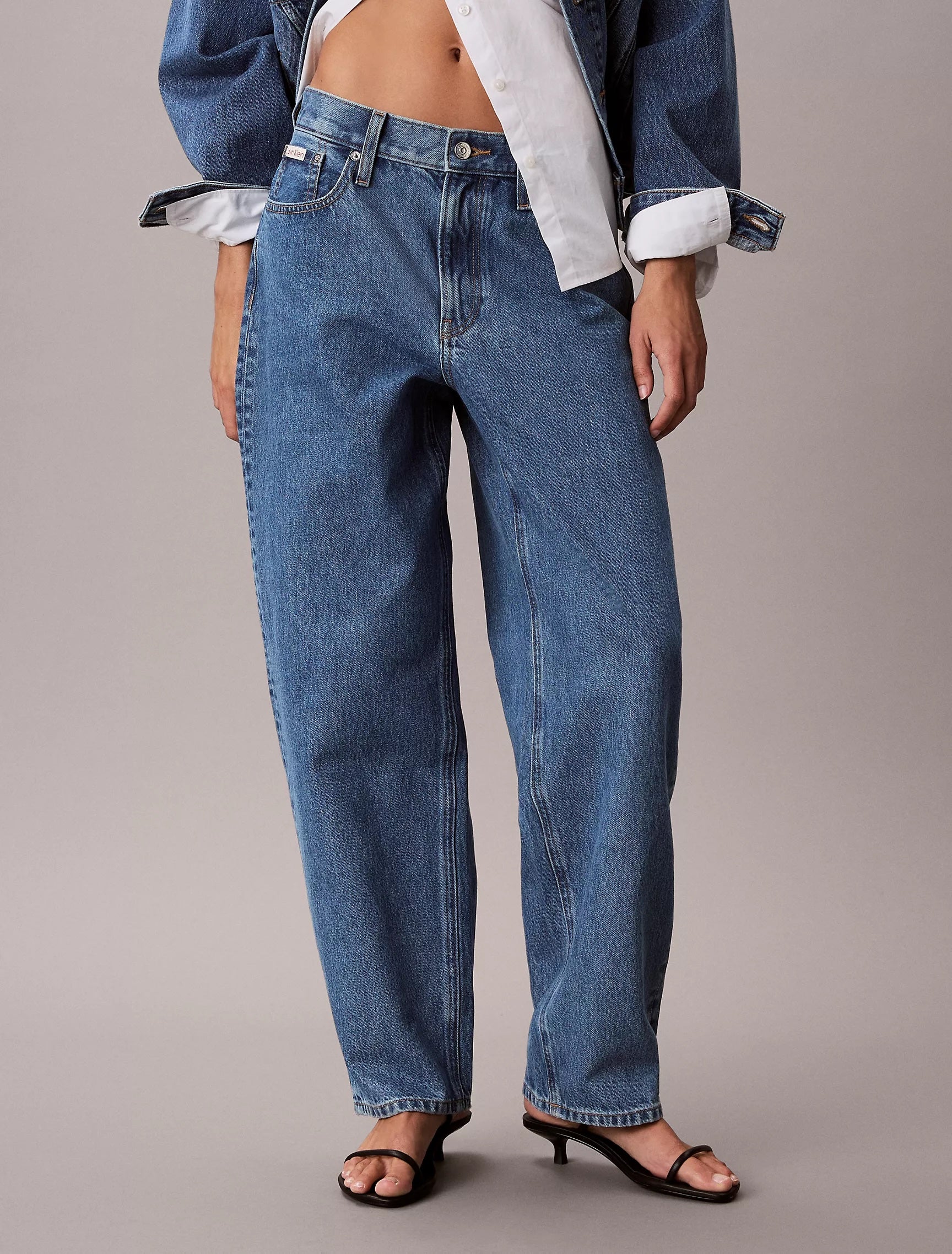 While I was there, I also pulled the '90s Loose jeans on for comparison. These offer a slightly curvier, almost subtle barrel silhouette. While they didn't have the puddle length I crave, they are a fantastic option for someone more petite or shorter, as they have a slightly cropped fit. They also feature a fun CK embroidery on the back pockets that adds a nice pop to classic denim.