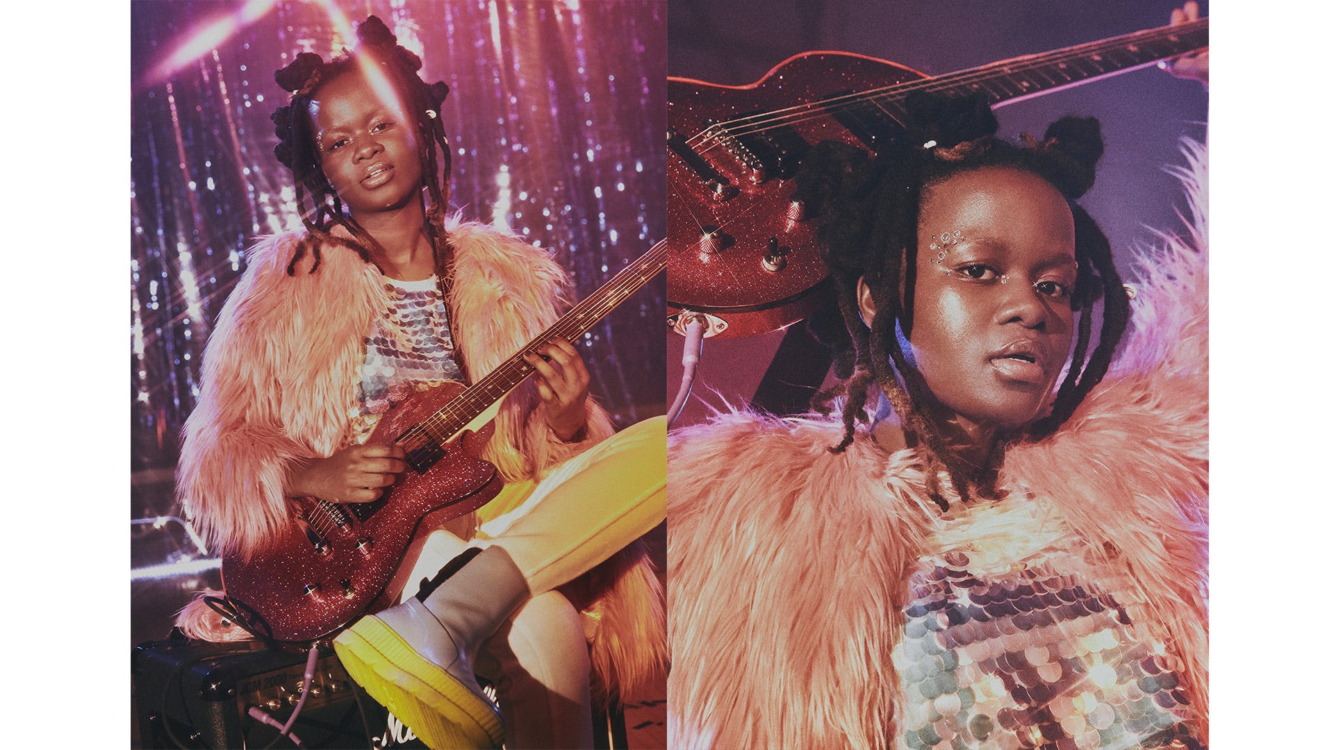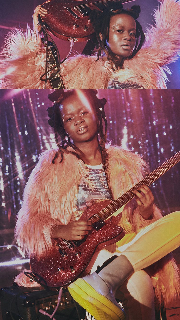What's better than wearing your comfiest track pants to the club? Pretty much nothing. To bring the athleisure staple into a party look, take a cue from Ella — guitarist and vocalist extraordinaire — and try them with a jazzed-up top (don't forget to Kirakira+ it, because, obviously), a fuzzy pink jacket, and two-tone boots that are quite literally ready for whatever.