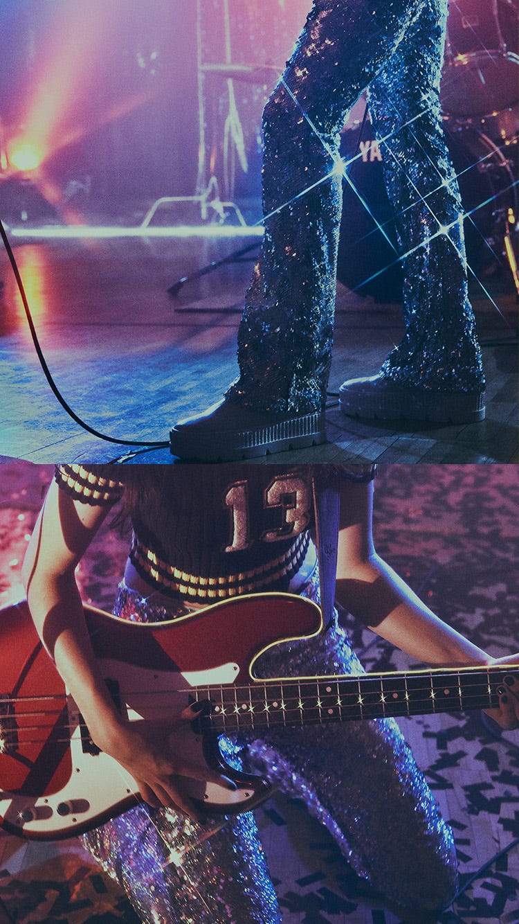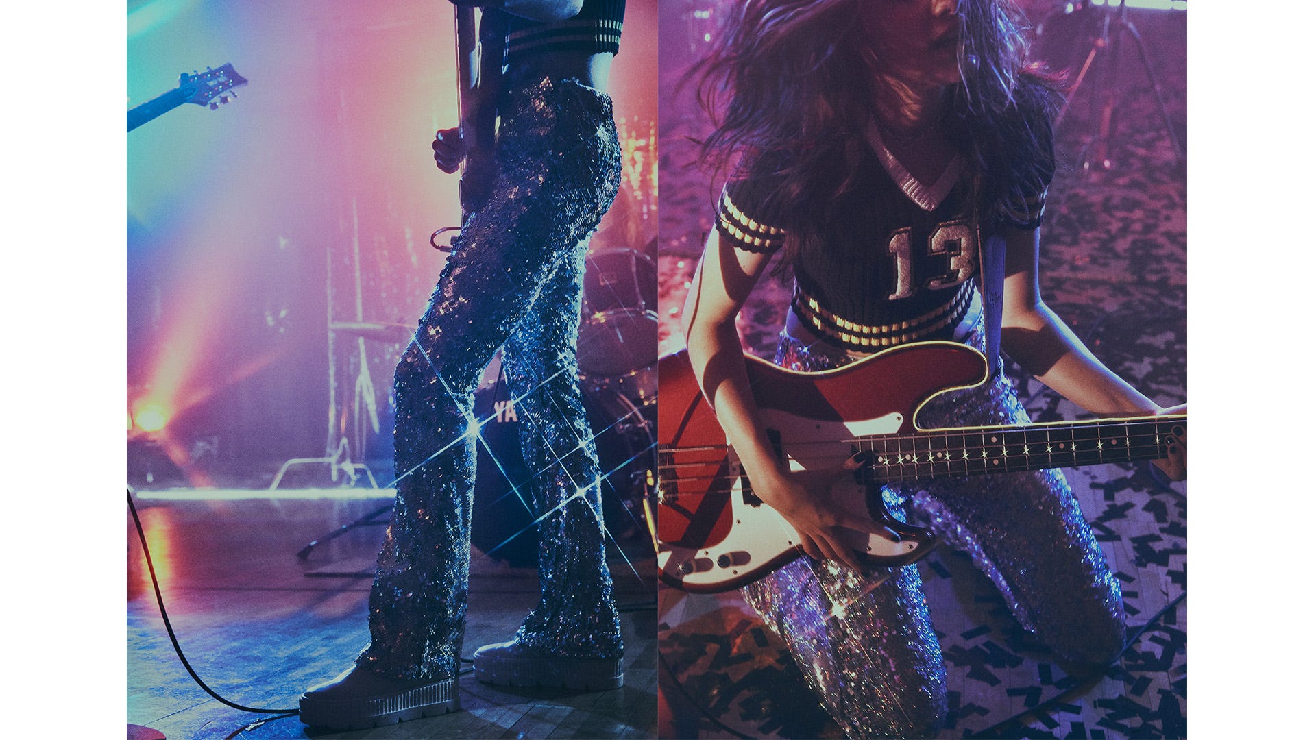 Though sequins might be the oldest trick in the party playbook, they feel modern (and are super fun to wear) when paired with low-key, dressed-down pieces. Here, Sabrina, the girl band's next-level bassist and vocalist, gives her slightly flared glittery pants the chill treatment with a cropped polo top and tread-sole sneaker boots.