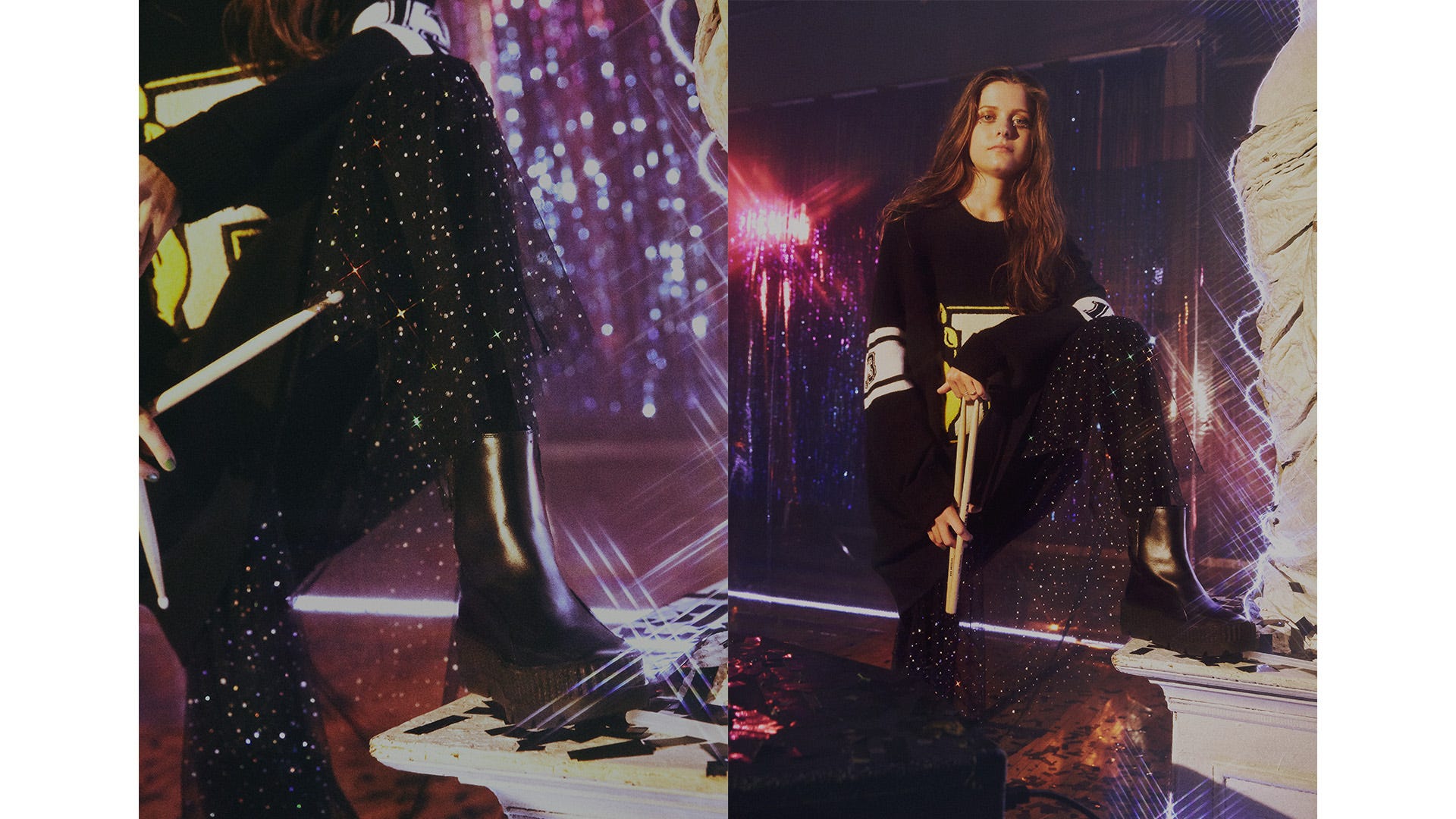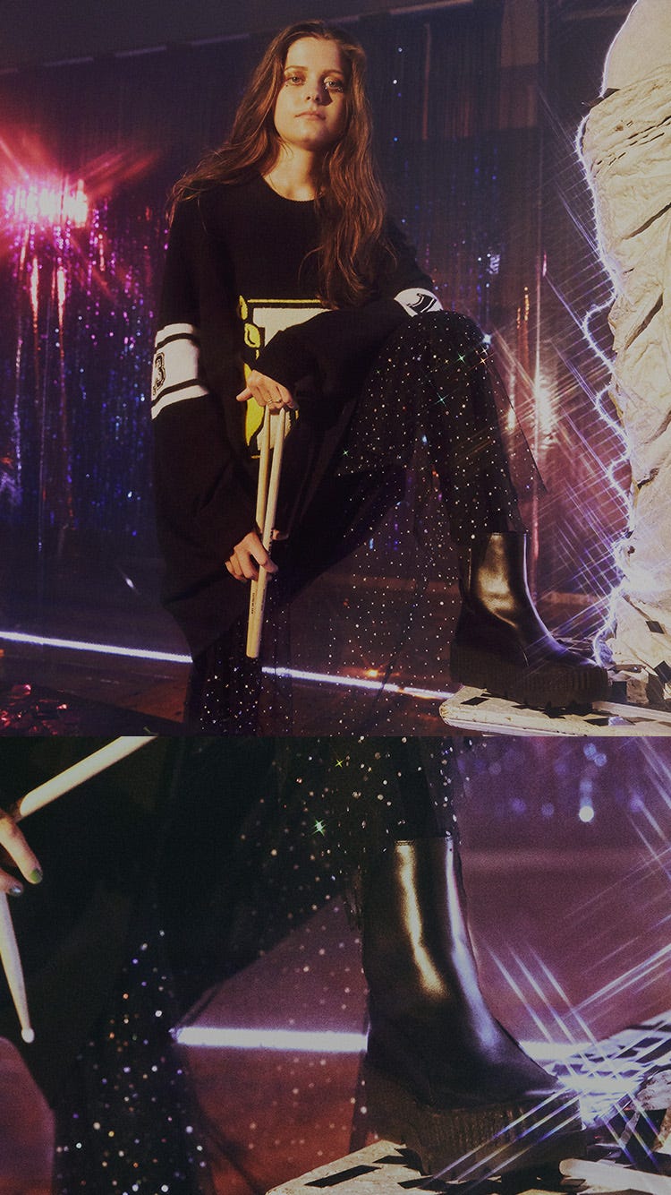 Knits aren't typically top-of-mind when it comes to dressing up, but they should be. As Eva — Pretty Sick's mega-talented drummer — proves, when styled with dramatic, fancy-feeling silhouettes like a sparkly tulle skirt, a slouchy sweater reads sleek, as opposed to sloppy. Pass on bare legs (it's too cold for that, TBH) with jeans layered underneath.