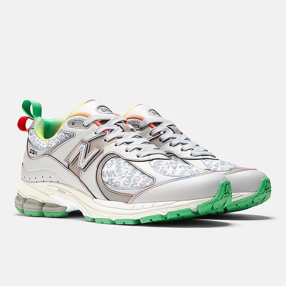 The new drop of New Balance’s 2002R sneaker offers two colorways – a gray and a turquoise – each fitted with Ganni logo panels for the brand's signature flair.