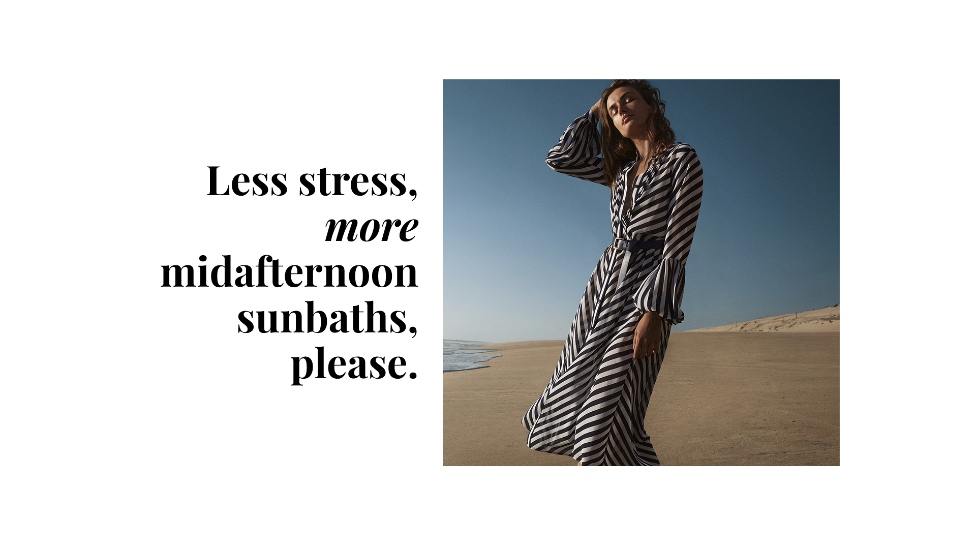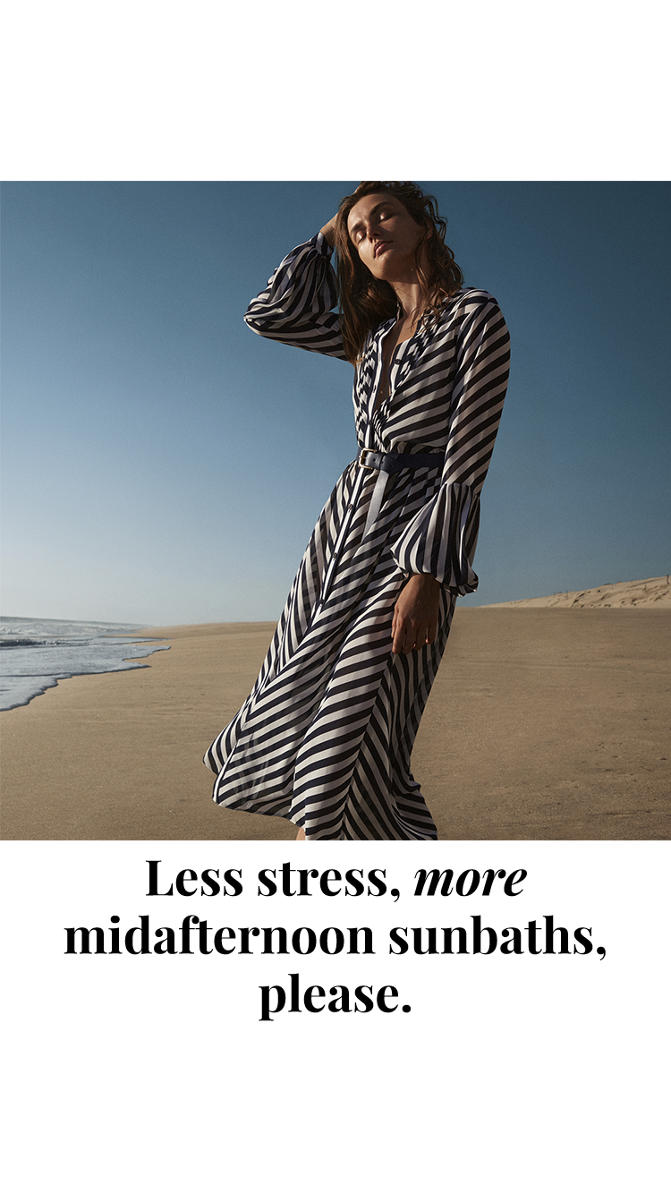 Go for pieces that can be dressed up or down to make your vacation wardrobe stretch further: This super-romantic floral shirtdress is low-key cool at its best with flats and a messy updo, or you can add a wide belt and clutch to hit the town. Wear a nautical-stripe dress on its own for lazing by the infinity pool all afternoon (frosé in hand, iPhone off). Then belt it and add platform heels for dinner in the town square by moonlight.