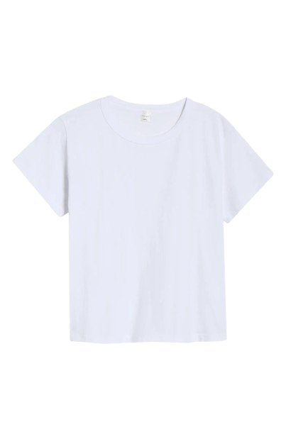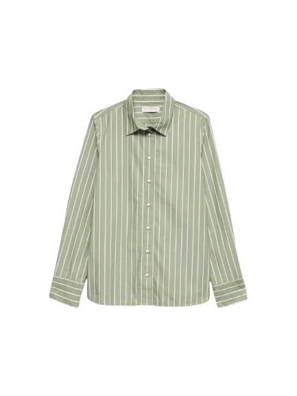 Built from wardrobe basics, this transitional outfit is simple yet powerful. A striped shirt and playful sneakers add just the right amount of coolness, while relaxed pants keep things polished and light.