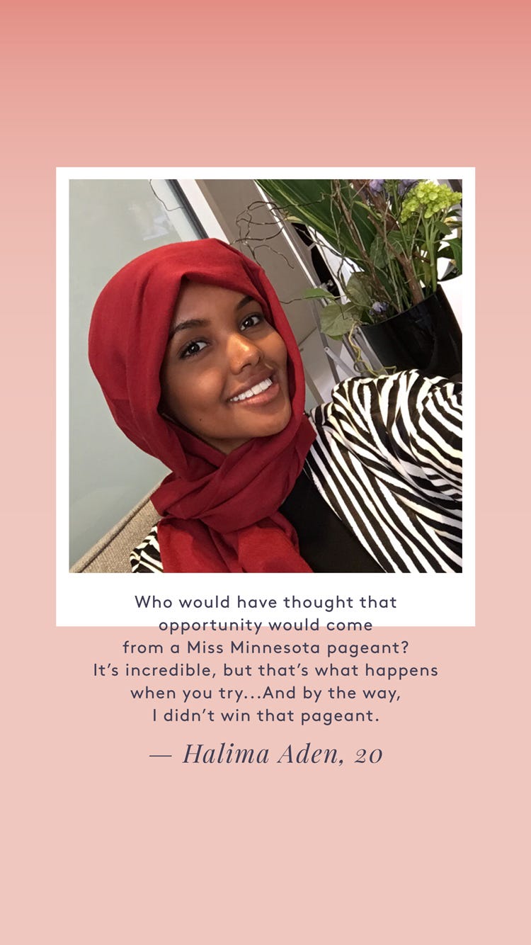 After being the first contestant to wear a hijab and a burkini during the Miss Minnesota USA pageant in 2016, Aden landed a modeling contract with IMG. Since then, Aden has graced the covers of Allure, CR Fashion Book and Vogue Arabia — all while proudly wearing her hijab.