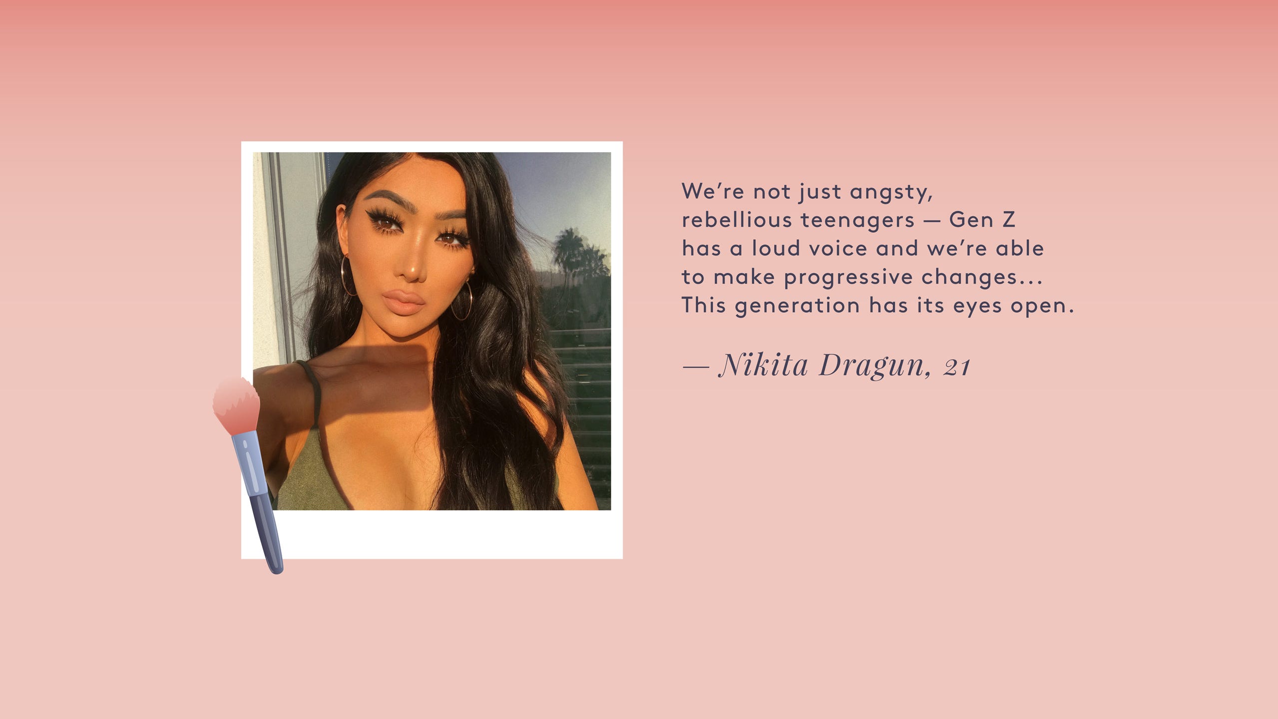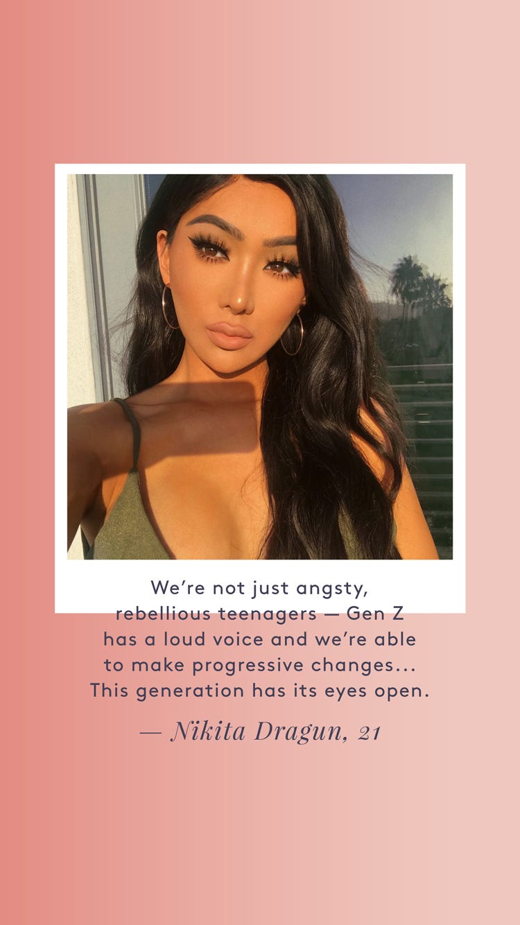 "People want to say that we're always on our phones, that we can’t hold a conversation or get a job — but that’s so far from the truth. The cookie-cutter way of life — go to college, get married, have a white picket fence — all of that is being questioned now. We’re not just angsty, rebellious teenagers — Gen Z has a loud voice and we’re able to make progressive changes in the political, social, and beauty worlds. This generation has its eyes open."
