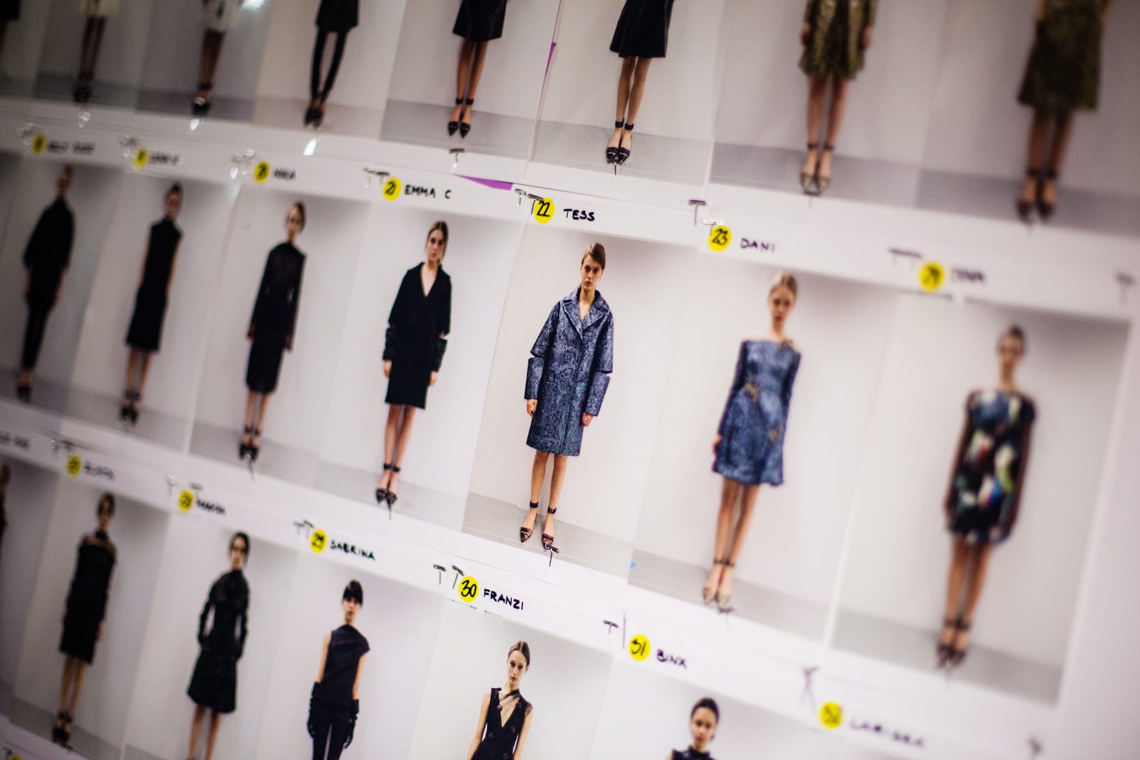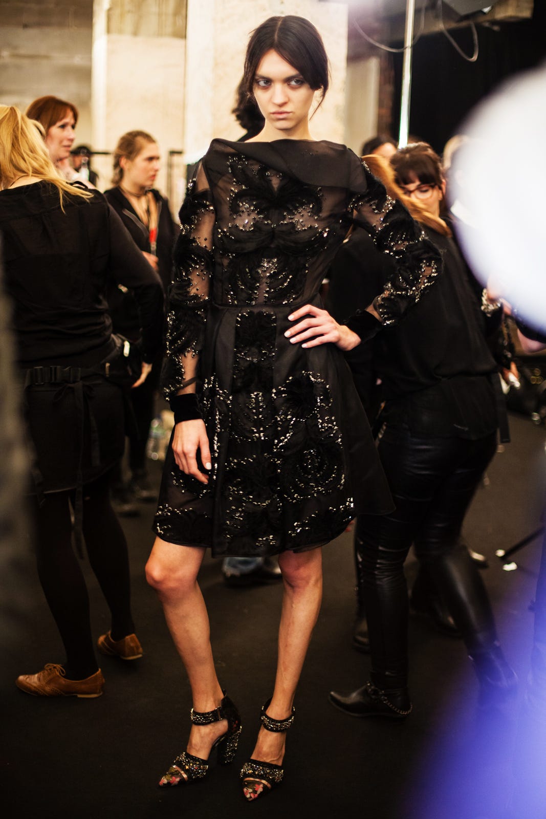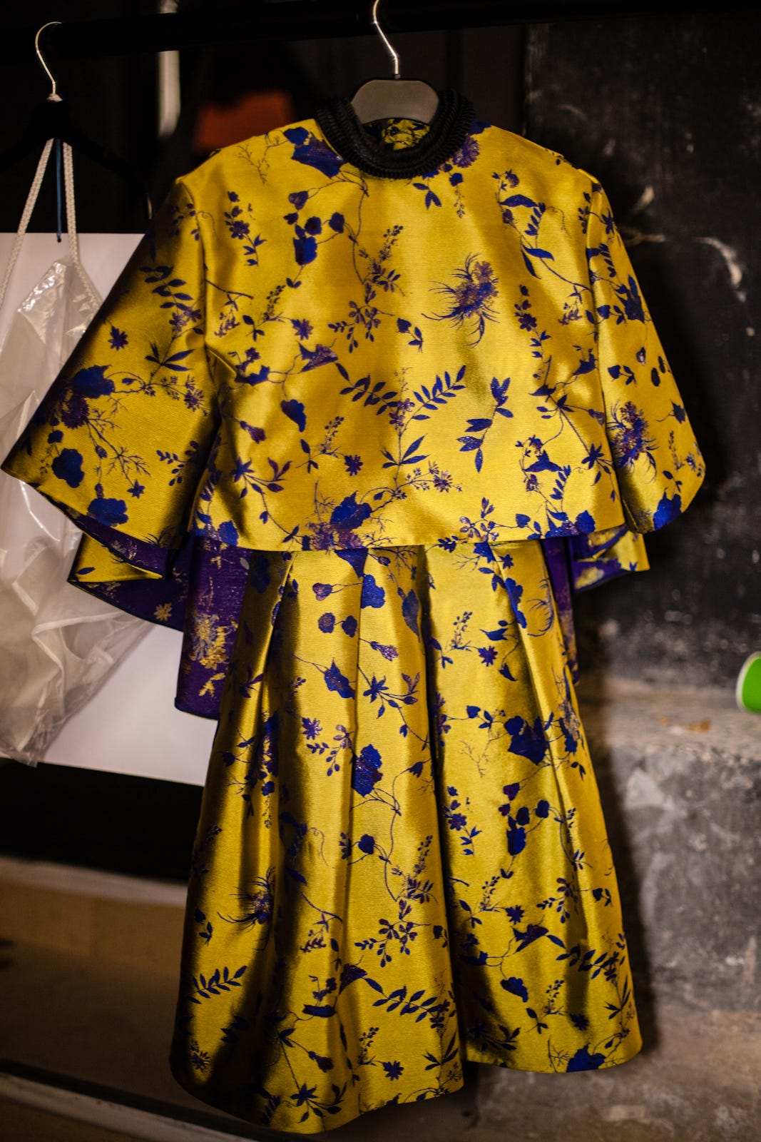 But, the line that strode down the dimly lit runway in London’s Old Selfridges Hotel wasn’t a greatest hits collection of the label's trademarks. Oh no, instead we were treated to a striking array of dresses, coats, and separates that appeared to hail from another era entirely. A bit of 16th century meets the swinging '60s, if you will. Thick damask and duchess satin provided structure to minidresses in shimmering shades of duck-egg blue, burnished gold, and russet red. These opulent fabrics, normally the go-to for ornate ball gowns, felt fresh and modern when used on dresses and skirts with hemlines more thigh-high than ankle-length. And, we liked the flat sandals that these after-dark looks were paired with. Perhaps, they're the coming season's answer to stiletto heels?