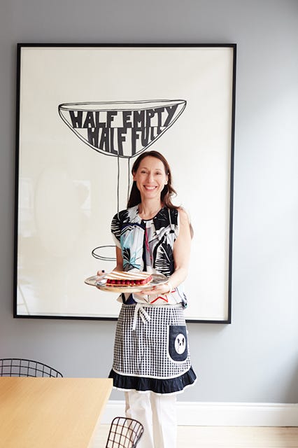 Where the tea salon is delicate, intricate, fanciful, and, of course, French, her home is at the opposite end of the decor spectrum. Spare, with clean-lined furnishings and modernist art, it brings a sense of humor and fun, injected with bold, vibrant colors.