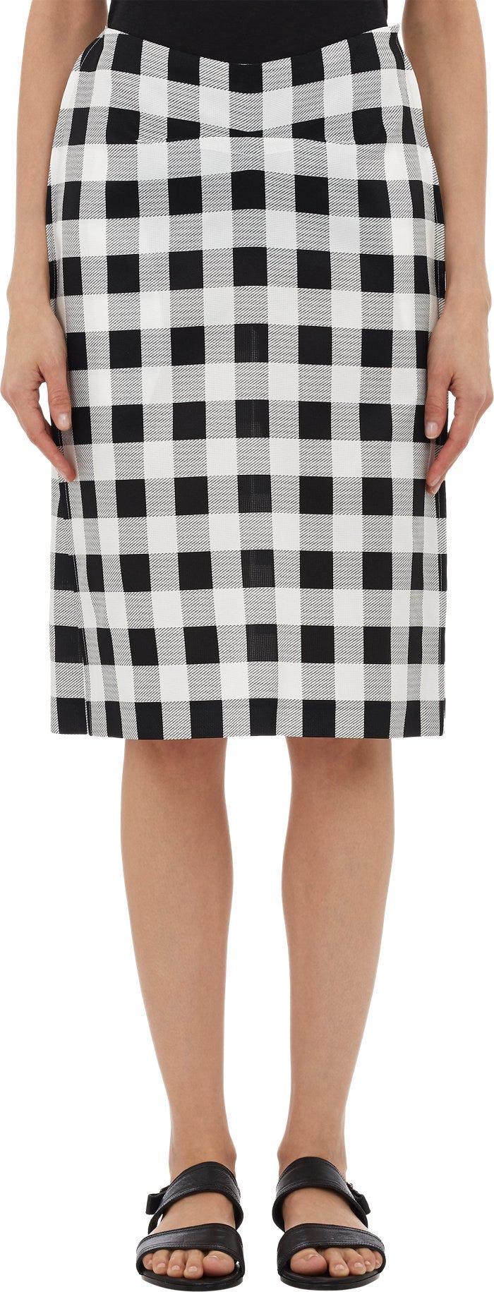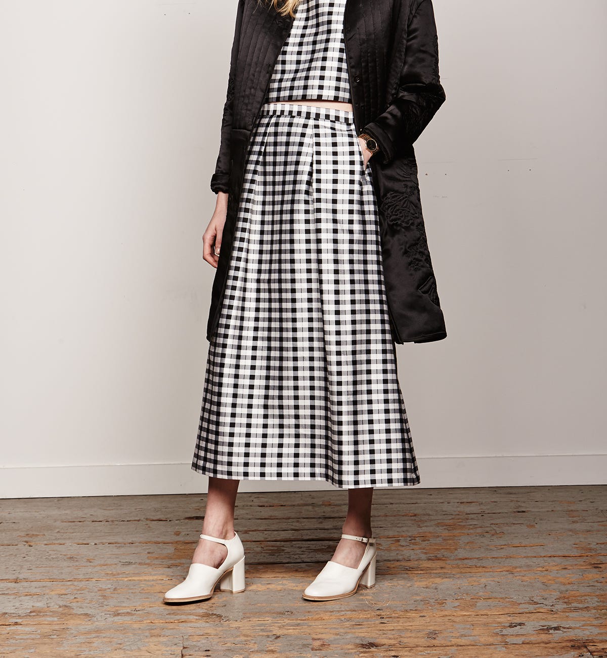 Minimal heels look great with a patterned pencil skirt. Nicole Warne of @garypeppergirl wears her Carolina Herrera pair with a gingham skirt from Altuzarra and a barely-there crop top.