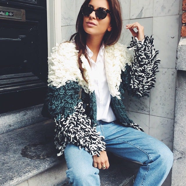 Lizzy of @lizzyvdligt has found the chicest (and coziest) solution for those windy spring days: a fuzzy, oversized cardigan from Tularosa.
