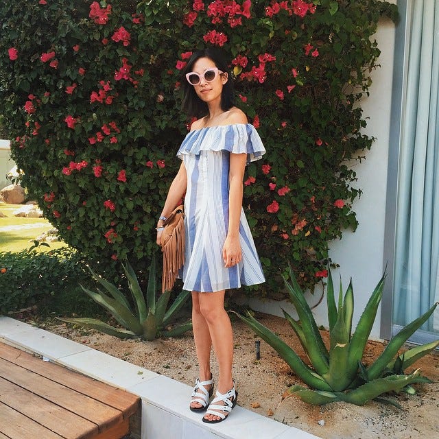 As if all the Coachella street style wasn't giving us enough Cali envy, Rachel Nguyen (@thatschic)'s striped, off-the-shoulder minidress has us booking our flights out West, stat.