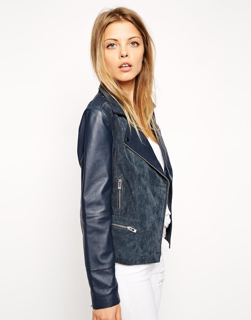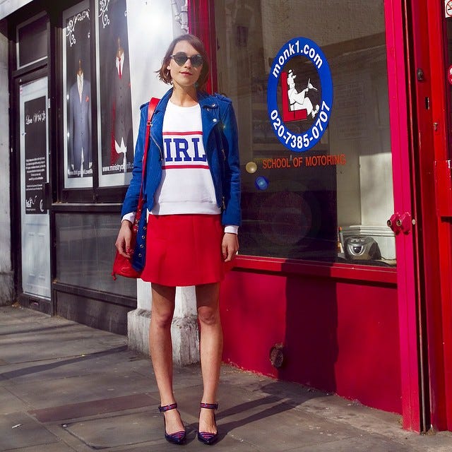 Give it up for the red, white, and blue. Ella Catliff of @lapetiteanglaise may be repping Britannia, but we love her patriotic look all the same (especially the cobalt moto jacket).