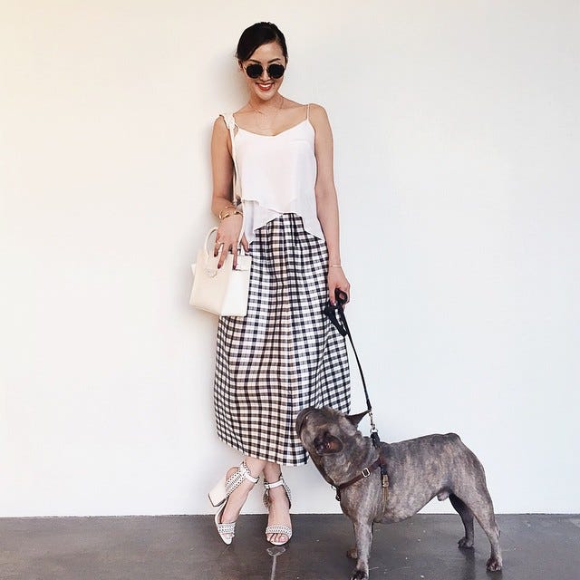Chriselle Lim (@chrisellelim) gives dog walkers everywhere a run for their money with her ensemble. What's cuter: the adorable pup, or her sweet checked skirt and flowy cami?