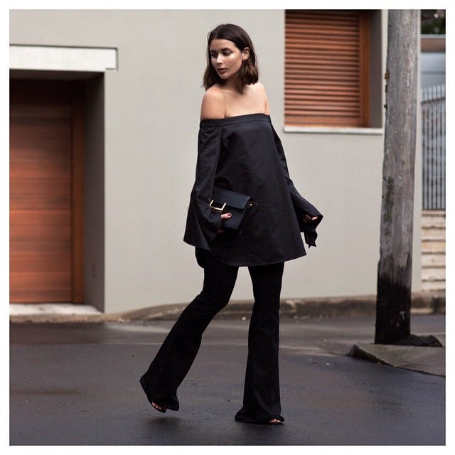 It may only be Monday, but Sara Donaldson of @harperandharley has us dreaming of the weekend with her off-the-shoulder tunic and flared denim. Seriously, can we fast-forward to Friday?