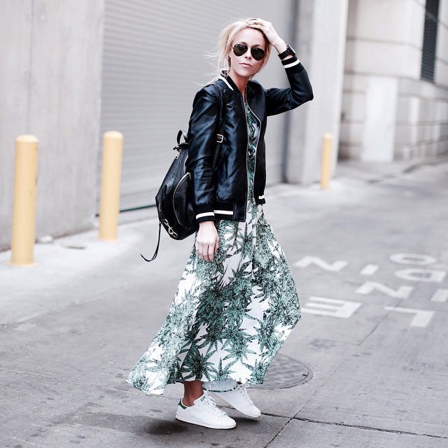 Mary Seng of @happilygrey makes her springy maxi-dress work in less than ideal weather with a sleek bomber jacket: warm, practical, and oh, so cool.