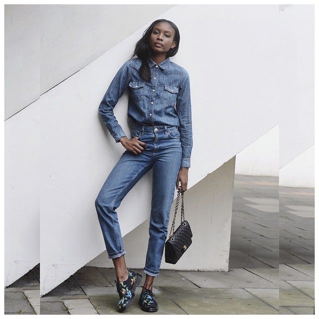 Natasha Ndlovu (@natashandlovu) gives the Canadian tuxedo a Brit-girl twist with some funky, floral lace-ups. And, you can't go wrong with the interlocking C's on your shoulder.