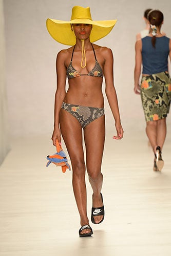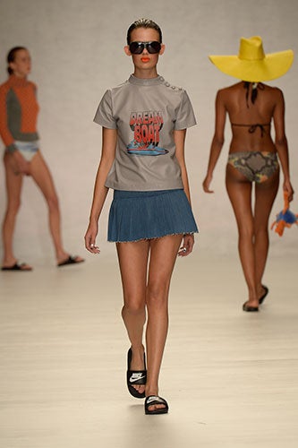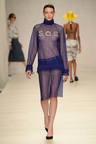 Closing the show, Ashley Williams took us all on a trip to Miami Beach for her sophomore Fashion East collection. Cheered on by her front-row-friends Pixie Geldof and Harry Styles, Williams gave the crowd plenty to smile about with her tongue-in-cheek tribute to '80s Americana. One-piece swimsuits, board shorts, and jumpsuits were emblazoned with the words "Dream Boat" and Williams' girls carried plush toy-shark clutches and wore pool slider sandals. Welcome to Miami, indeed.