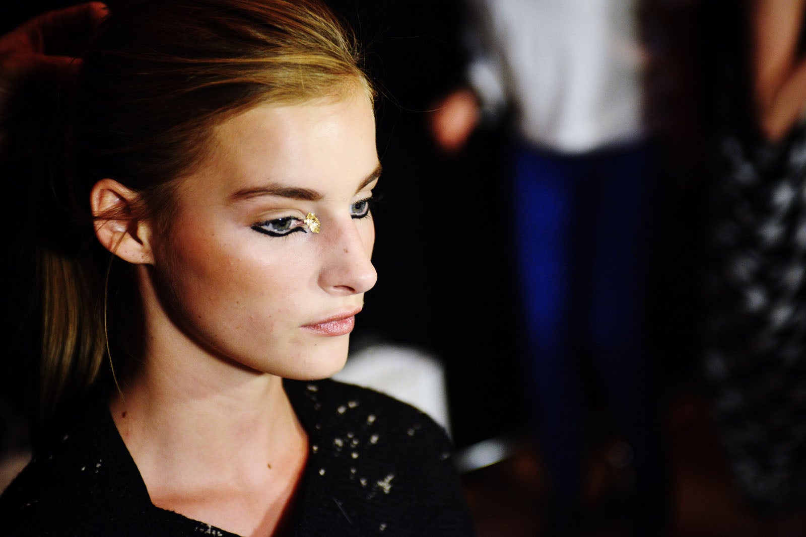 While almost all of the shows at New York Fashion Week set our hearts aflutter, none get our girlie sensibilities in quite such a frenzy as the Marchesa show. Set in the insanely gorgeous Vanderbilt Hall at Grand Central Terminal this season, the glamorous energy was palpable immediately upon entering the backstage-prep area. Lit with a diffused glow, models such as Hilary Rhoda (our fave!) got the tribal treatment with graphic-glam hairstyles by Renato Campora of Frédéric Fekkai and haunting, gold-and-black eyes by Talia Shobrook, lead makeup artist at Laura Mercier.