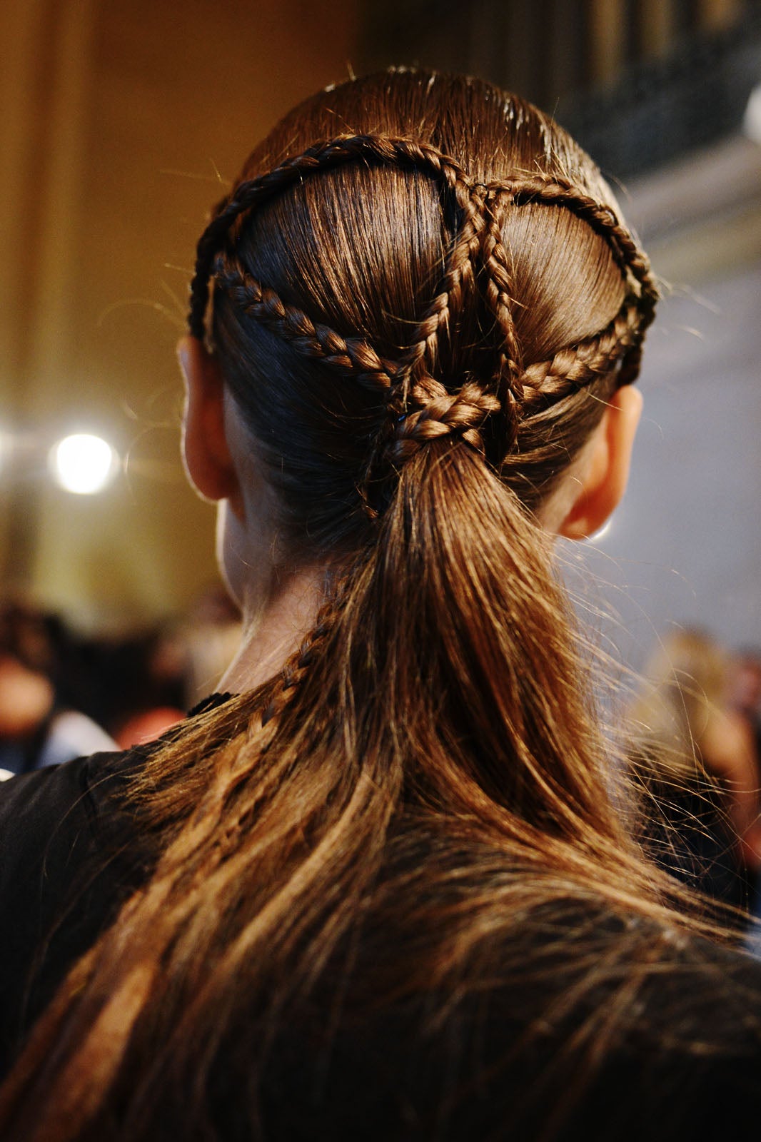 For the luxurious locks, Campora created a glassy ponytail with Fekkai Coiff Bouffant Lifting and Texturizing Spray Gel, and models with shorter hair were treated with faux tails to get a long, straight, luxurious pony. Campora created a slick middle part and braided the two front sections into two braids each, crisscrossing the two plaits into a U-formation and pinning. Finally, he wrapped the ends of the braids around the base of the ponytail and finished with Fekkai Coiff Sheer Hold Hair Spray and Fekkai Brilliant Glossing Sheer Shine Mist. Says Campora: "I wanted to create slick, graphic, elegant hair to work with the silouettes of the collection. The braids add a decorative element to a sleek and slightly futuristic ponytail."